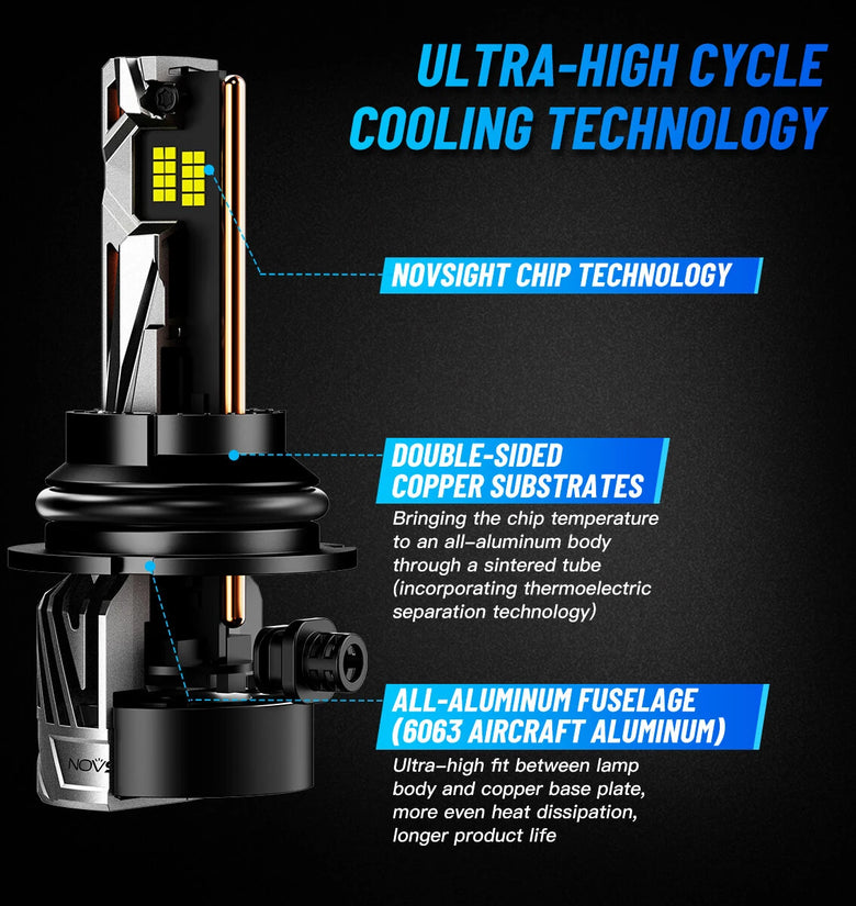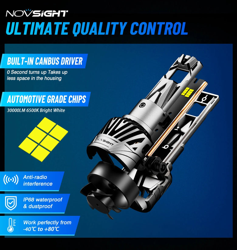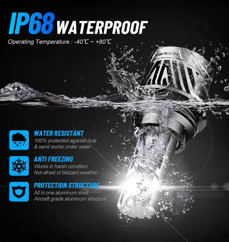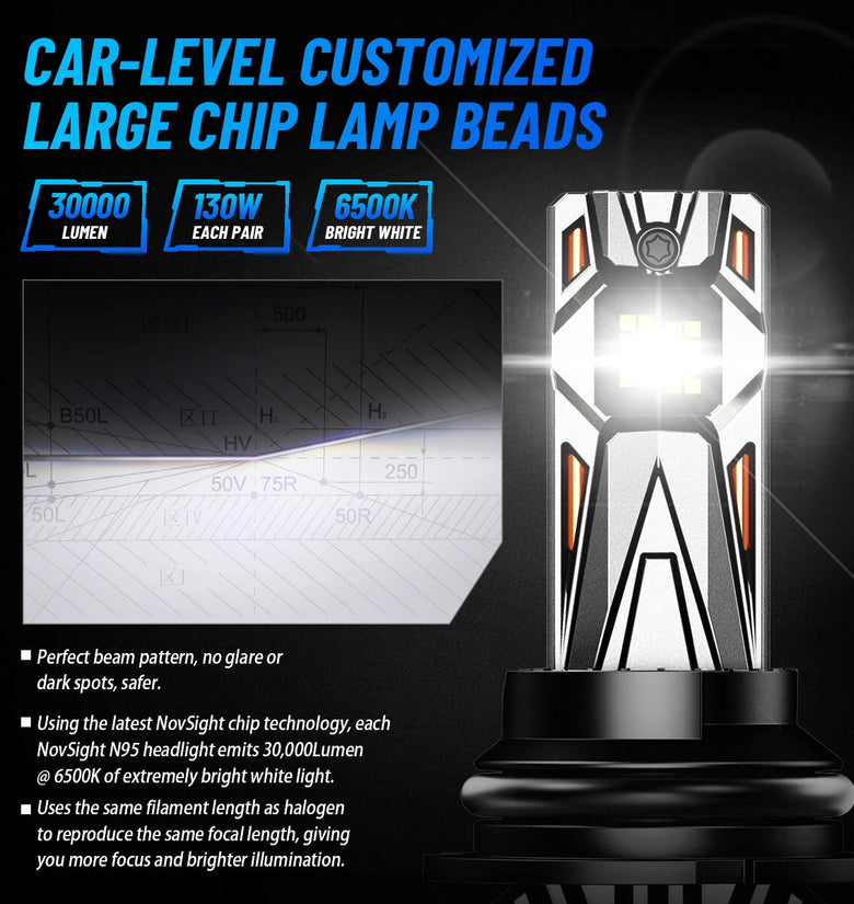 - High Brightness: Utilizing advanced Novsight chip technology, these headlights emit 30,000 lumens per pair at 6500K, ensuring exceptional brightness and improved night visibility. The light output closely mimics daylight for clearer and safer driving.