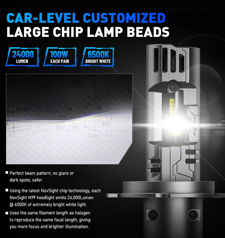 - High Brightness: Utilizing advanced NovSight chip technology, each N99 headlight outputs a staggering 24,000 lumens per pair at a cool white 6500K. This intense luminosity ensures exceptional visibility, enhancing safety in diverse driving conditions.