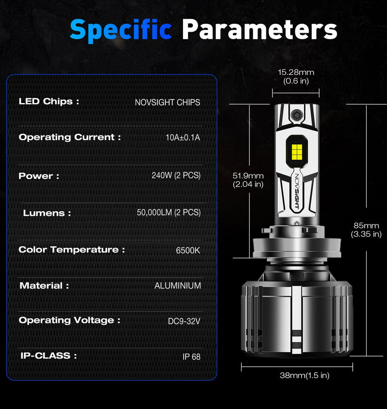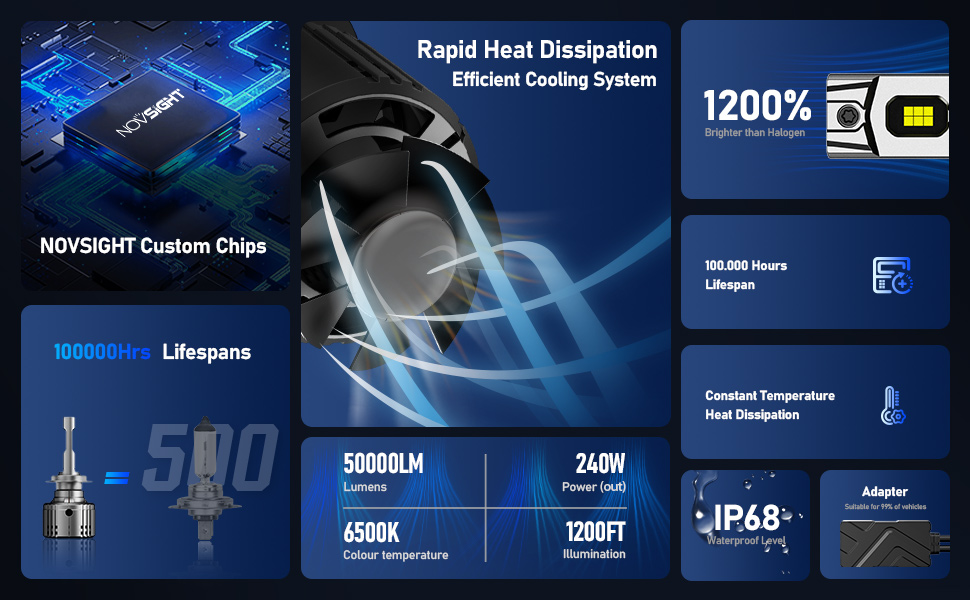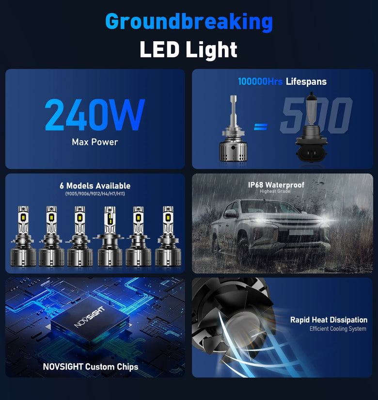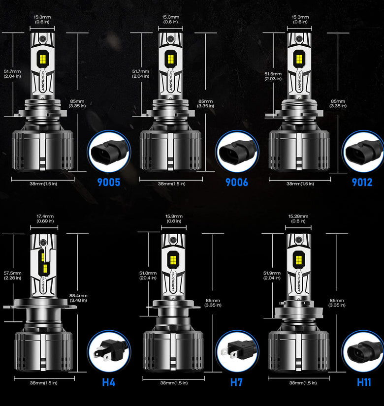 Delivering up to 50,000 lumens per set, these LED headlights provide unmatched illumination, 1200% brighter than traditional halogen bulbs, allowing you to see clearer and further in various driving conditions.