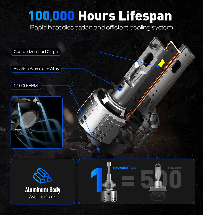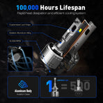Equipped with an advanced cooling system featuring a 12,000 RPM fan and aviation-grade aluminum housing, this headlight boasts an impressive lifespan of up to 100,000 hours, eliminating frequent replacements.