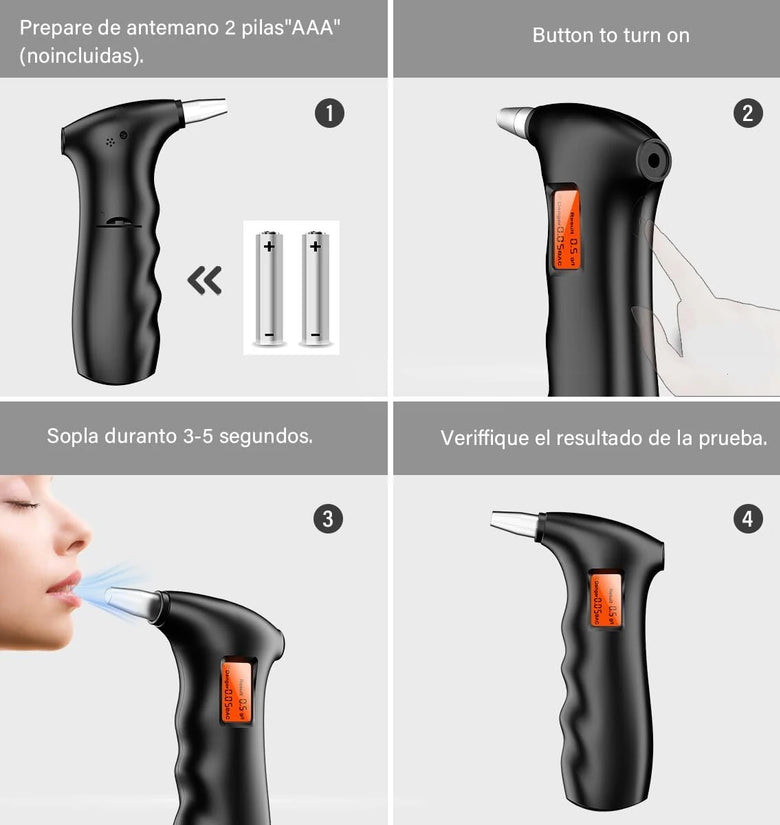 - Just insert 2 AAA batteries, then you need to press the button for a few seconds to start, preheat for 15 seconds, and then blow into the alcohol tester for 3-5 seconds, and you will get a real-time answer soon. There are 2 units of measurement-‰BAC, g/l.