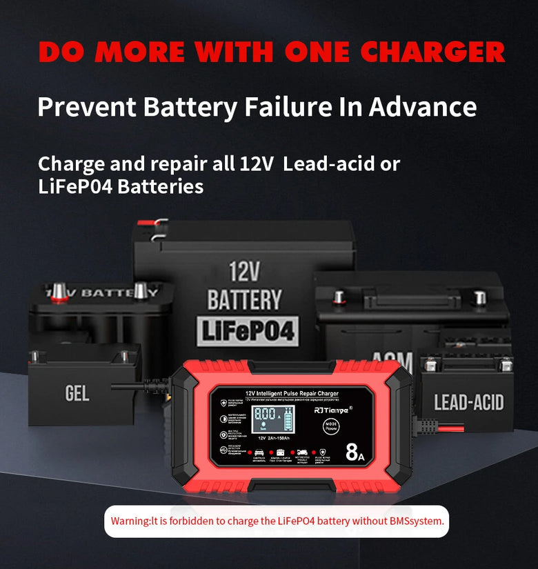 - Universal Compatibility: Charge and repair all 12V lead-acid or LiFePO4 batteries, making it versatile for various battery types including AGM, GEL, and more.