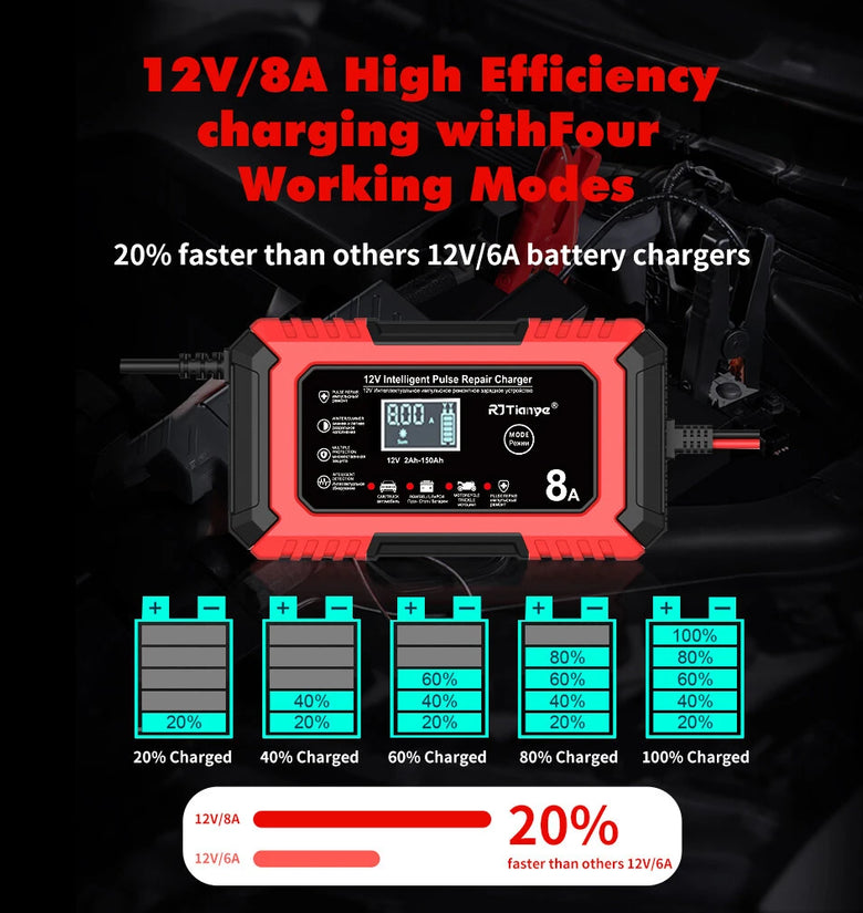 - High-Efficiency Charging: 12V/8A output accelerates charging 20% faster compared to other 12V/6A chargers. Ensures swift and effective charging for batteries from 4Ah to 150Ah capacity.