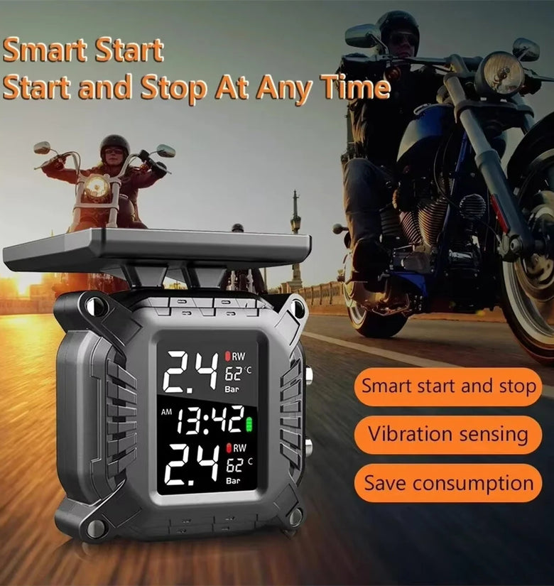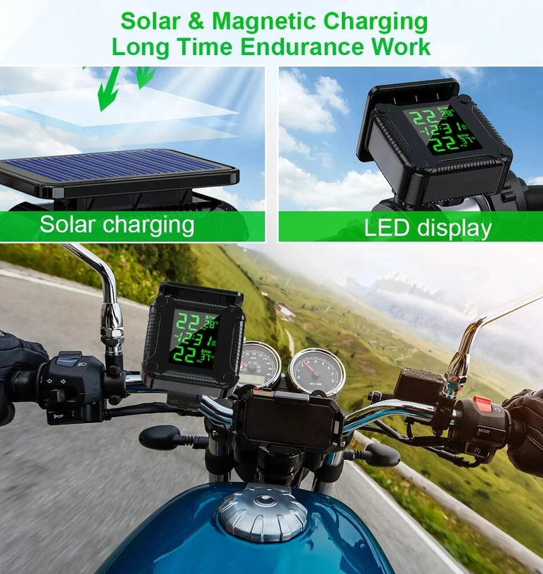 • Solar Charging TPMS Motorcycle Tire Pressure System Tyre Temperature Alarm LED Display IP67 Waterproof