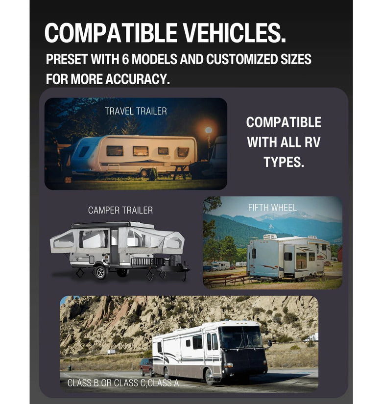 1. Universal Compatibility: The RVS01 supports a wide range of RV types, including Class A, Class B, Class C, Fifth Wheels, Travel Trailers, and Hybrid/Pop-Up Campers. No matter your vehicle, this device ensures seamless integration, adapting to various models effortlessly.
