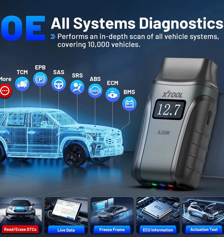 XTOOL ANYSCAN A30M QUICK ALL SYSTEMS DIAGNOSISAnyscan A30M can access and scan all available modules on 80+ American, Euroepan and Asian makes and models including ABS, SRS, ECM, TCM, Brakes, BCM, TPM and etc to read and clear codes, view live data, freeze frame, perform active tests and retrieve ECU info.Display live data stream in text or graph like misfire data, transmission fluid/Oil temperature, cylinder balance rates, engine rpm, mass air flow sensor data, fuel pressure, actual fuel temperature vs desired fuel temperature and etc;➤Auto VIN➤Read ECU Information➤Read Trouble Code➤Clear Trouble Code➤Read Live Data➤Read Freeze Frame
