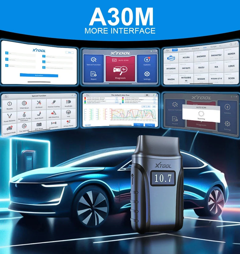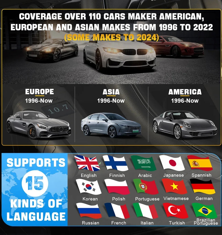 OVERAGE OVER 110 CARS MAKER FROM 1996 TO 2023This XTOOL all-in-one scanner is specially customized for large Maintenance Shops, Workshops, Car Dealers, Auto Mechanic. Work for 12V Petrol Sedans, SUVs, Minivans and Light-Duty Trucks across the globe, including:Europe: For Audi, For Skoda, For EurFORD, For Opel, For Bugatti BenzTRANSP, For Lamborghini, For Bentley, For SEAT, For MINI, For ROLLS, For BMW, For SMART, For VAUXHALL, For PORSCHE For JAGUAR, For Volkswagen Nutzfahrzeuge, For MAYBACH, For LANDROVER, For BENZ, For DACIA, For CITROEN, For RENAULT, For VOLVO, For PEUGEOT, For VW...America: For GMC, For CADILLAC, For CHEVROLET, For BUICK, For PONTIAC, For SATURN, For HUMMER, For DODGE, For USAFORD, For CHRYSLER, For GM...China: For SAIC-MG, For GREAT WALL, For BYD...Asia: For KIA, For INFINTI, For DAIHATSU, For ISUZU, For SSANGYOUNG, For SUZUKI, For HYUNDAI, For MAZDA, For ACURA, For HONDA, For SUBARU, For LEXUS, For NISSAN, For SCION, For TOYOTA, For MITSUBISHI...Australia: For AUFORD, For HOLDEN...Russian: For ZAZ, For IZH, For PAZ, For UAZ, For VAZ, For GAZ, For Lada....Malaysia: For Perodua, For Proton...XTOOL A30M SUPPORTS 15 KINDS OF LANGUAGEEnglish, Spanish, German, French, Italian, Finnish, Arabic, Japanese, Korean, Polish, Portuguese, Vietnamese, Russian, Simplified Chinese and traditional Chinese.Note: English is the basic language. If you need other languages, please contact us to authorize other languages.