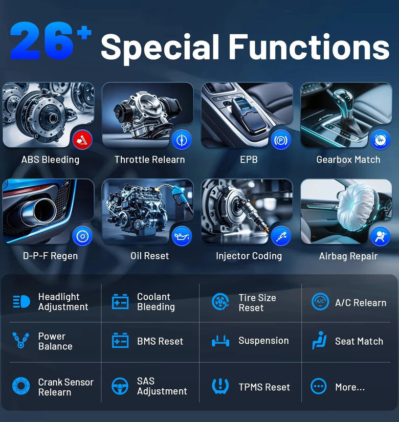 21 ADVANCED COMMON MAINTENANCE FUNCTIONS1. Throttle Relearn: Adjusts the throttle position to control the intake air volume, and indirectly control the fuel injection volume to reduce fuel consumption.2. TPMS (Tire Pressure Monitor System) Reset: When the tire pressure is insufficient, it is necessary to reset the tire pressure after replacing the tire or sensor.3. Gear Learning: Perform gear learning for the car when the engine ECU, the crankshaft position sensor, or the crankshaft flywheel is replaced. match and learn the sensor. Also used to test sensors.4. DPF Regeneration: Clear PM from the DPF filter through oxidation or combustion to stabilize the filter performance.5. Injector Coding: Code a new injector to better identify injectors to accurately control fuel injection.6. ABS Bleeding: Bleed the air out of the ABS system for firm brake pedals.7. SAS Adjustment: Clear the fault steering angle sensor memories, perform reset steering angle sensor, and turn off steering wheel warning light.8. Airbag Reset: After replacing the Airbag, reset the Airbag data and clear the collision data.Also including: Power Balance, Oil Reset, EPB Reset, BMS Reset, Suspension, Instrument Cluster, Gearbox (Transmission) Match, Headlight Adjustment, Window Initialization, Seat Calibration, Electronic Pump Activation, Transport Mode, Tire Upgrade, are all available.Note: Please provide your specific car model and VIN number to check compatibility before purchasing.
