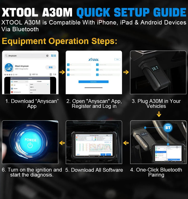 Equipment Operation Steps:1. Download the 'Anyscan' App from Appplication Store or Google Play or Official Website2. Bind and activate the dongle in the APP, Find out S/N and activation code on the quality certificate.3. Plug the A30M interface adapter into OBD2 Port4. Click for BT setting on APP / smart device and pairing with A30M5. Turn on the ignition and start the diagnosis.If you have any issues, please come to us with S/N and the OS of your smart device for support. Please be reminded that we stand behind our products and will always do whatever it takes to solve your any issues.