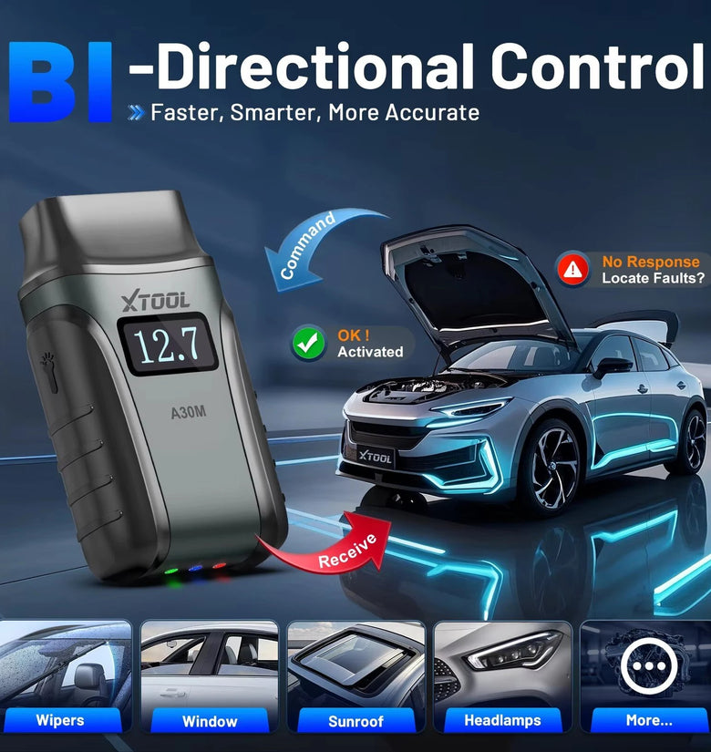 BI-DIRECTIONAL CONTROL/ACTIVE TESTXTOOL A30M is a Bi-Directional scanning tool that allows you to request information or command modules to perform specific tests and functions while observing the resulting data for troubleshooting and quick fixes. The Bi-Directional control feature saves machinists/shops a lot of time and helps them get more work done every day.➤EVAP Tests➤Compression Test➤Turn On/Off Radiator Fan➤A/C Clutch On/Off➤Fuel Pump➤Window/Mirror/Door Lock Test➤Pump and Value Tests➤Interior & Exterior Lights Test➤Sound Horn TestNote: Available active tests vary by vehicle system. Please send the specific car model to the seller to check the compatibility before purchasing.