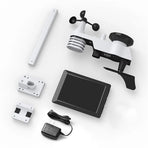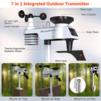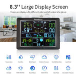 1. The wireless weather station comes with a large 8.3' display that shows indoor/outdoor temperature and humidity, wind speed/direction, barometric pressure, rainfall data, UV index, time, date, moon phase, and alarm clock.