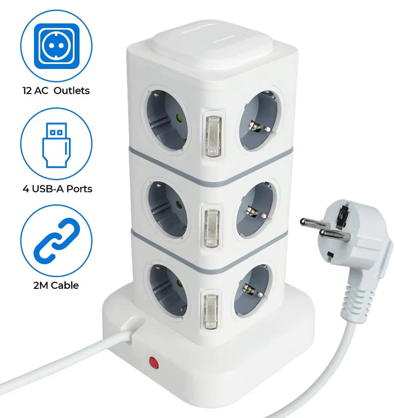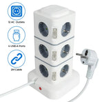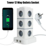 • 2500W Tower 12-way Outlets EU Socket with 4 USB Multi Power Strip with 2.8M Extension Cord Built-in LED Light Switch Overload Protector 250V 10A