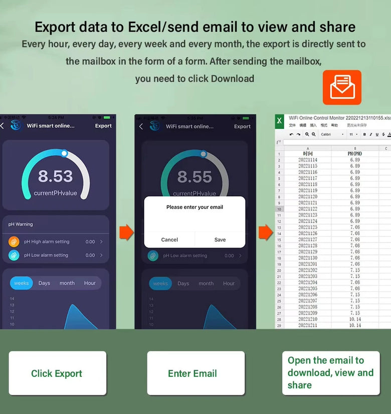 Automatically stores and saves data every 30 days, with data sets transmitted every 15 seconds. Analyze data curve graphs, and export data in Excel format to your phone or PC.
