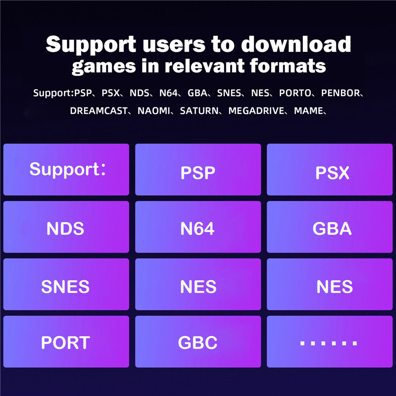 1. Preloaded with 30+ emulators compatible with PSP, PSX, NDS, GBA, SNES, NES, Dreamcast, Naomi, Saturn, and more.1x 64G TF Card