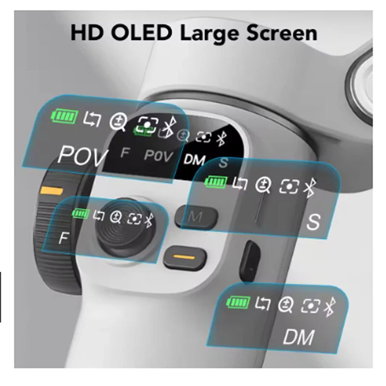 The gimbal features a large, upgraded OLED screen for clear and accessible mode selection and settings.
