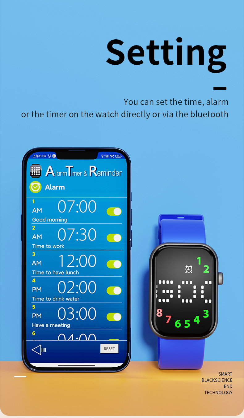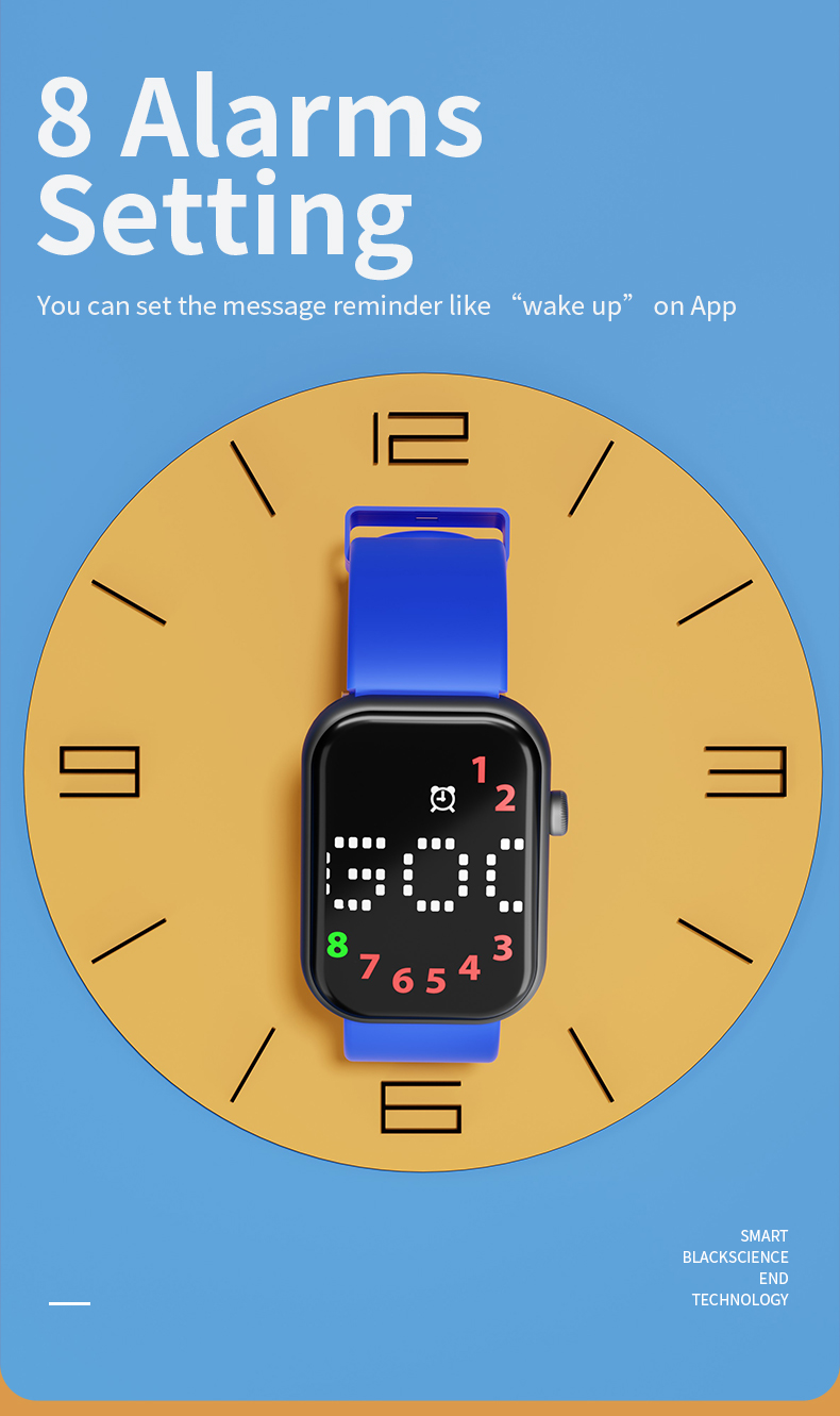 3. 8 Alarm Settings: Customizable time and notification alerts directly from the watch or via bluetooth app integration.