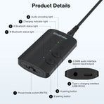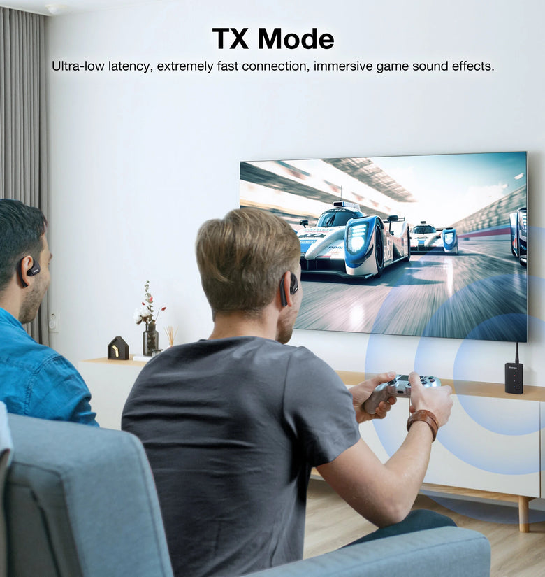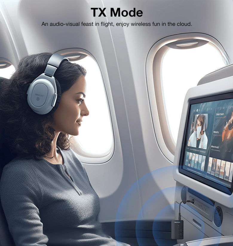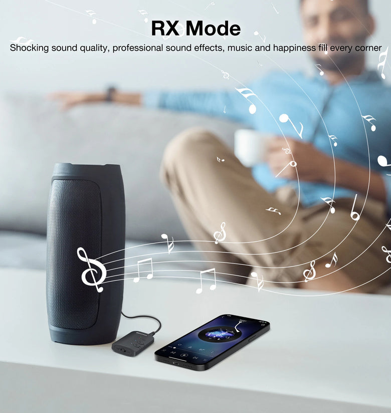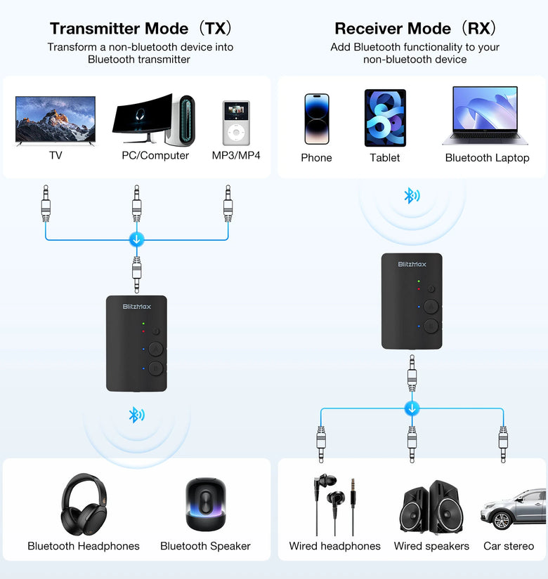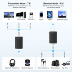 1. 2 in 1 Bluetooth Audio Transmitter Receiver: Wireless adapter combines Bluetooth transmitter and receiver with 3.5mm auxiliary jack. In TX mode, helps you transmit audio from devices like TVs, PCs, and airplane entertainment to your Bluetooth headphones, earbuds, or speakers. In RX mode, lets you connect your smartphone to wired speakers or earphones wirelessly from Bluetooth.