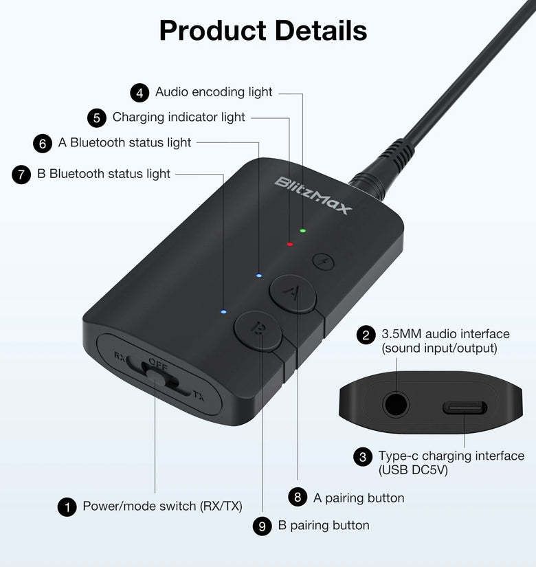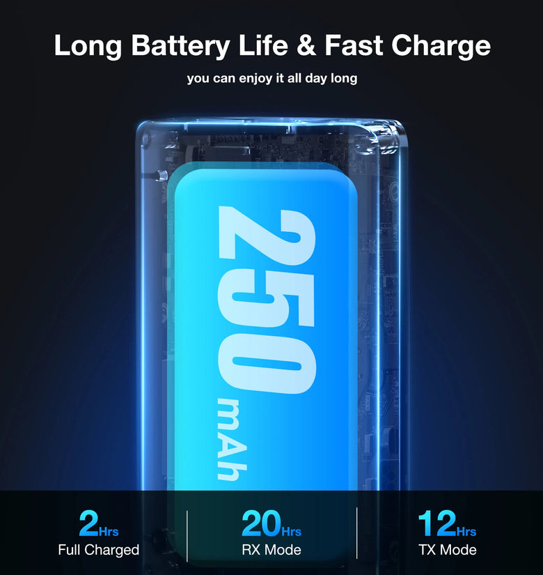 5. Long Battery Life: The charging time of the Bluetooth 5.2 transceiver is about 2 hours, the RX service time is at least 20 hours, and the TX service time can be 12 hours (when fully charged). The Bluetooth adapter can also be used while charging, which is very convenient.