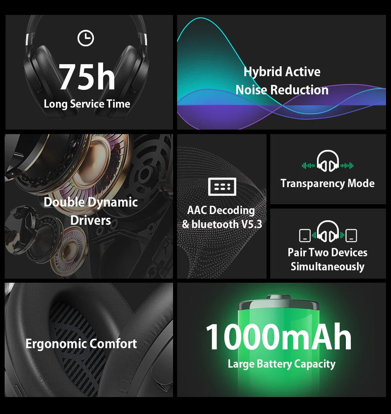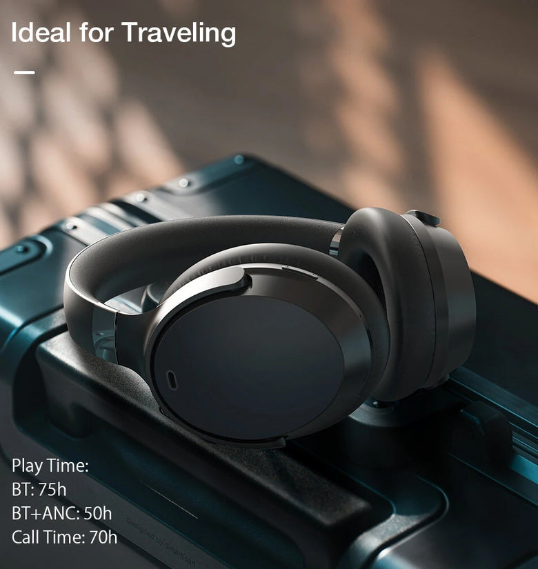 Build-in 1000mAh ultra-large battery capacity. 50 hours of playtime in noise cancelling mode will cover an around-the-world flight without needing to recharge.