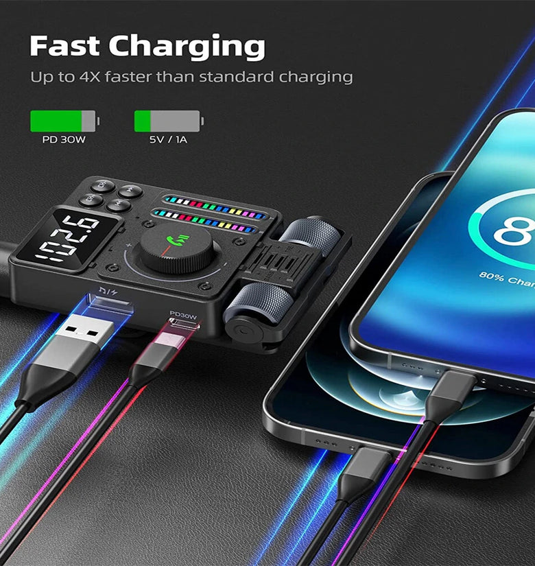 2. Multiple Charging Options: This FM transmitter supports PD30W and 5V/2.4A output, allowing you to charge your devices quickly and efficiently. The input range of 12-24V makes it compatible with most car models, and the USB support for up to 32GB maximizes your storage options.