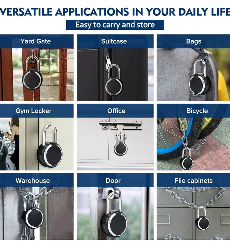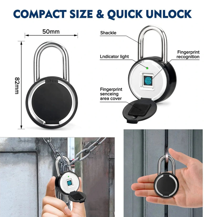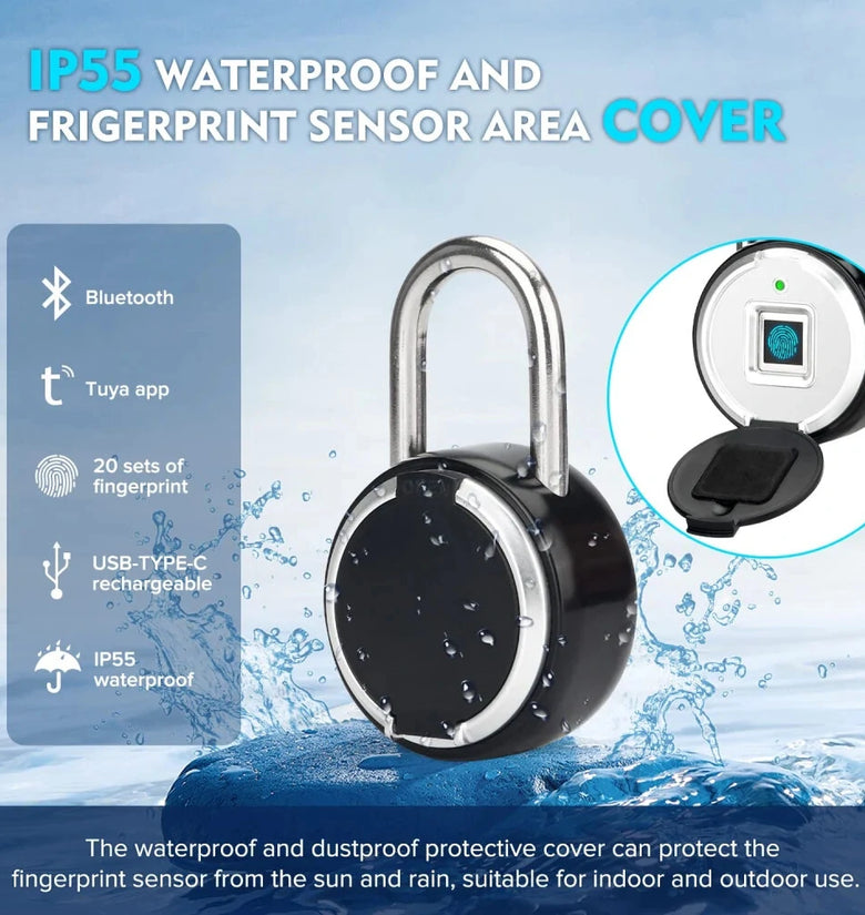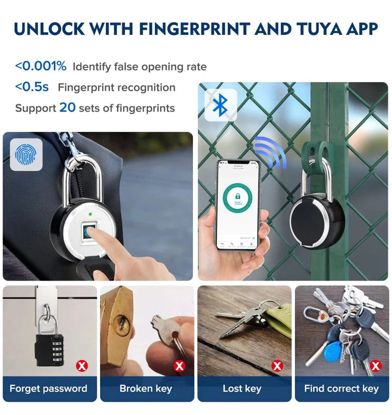 1. Smart Fingerprint Padlock: This padlock features fingerprint recognition to unlock/lock within 0.5 seconds. It can also be connected to the Tuya App via bluetooth for additional functionalities.