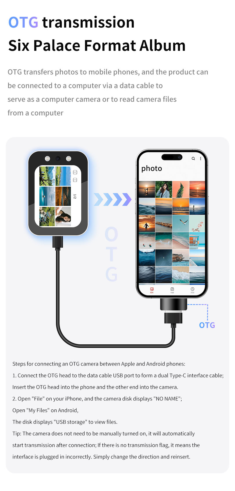 6. OTG Connectivity: Allows seamless transfer of photos and files to smartphones or computers via USB connection.