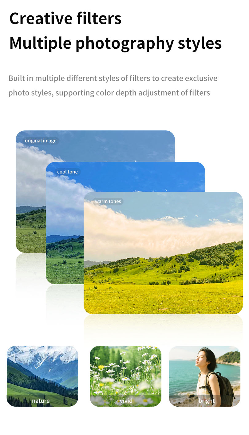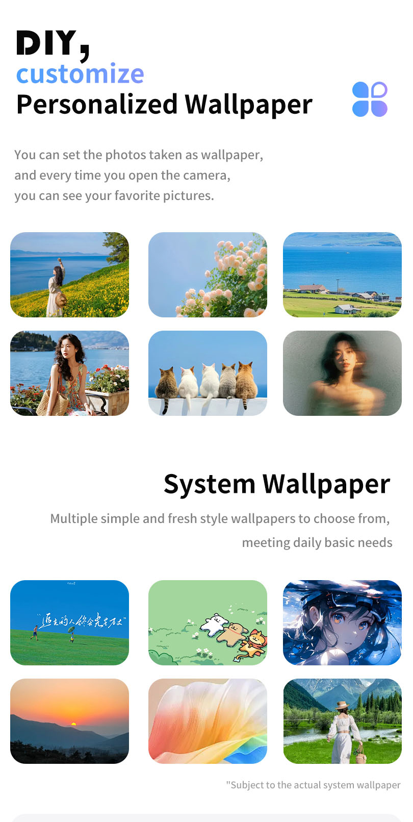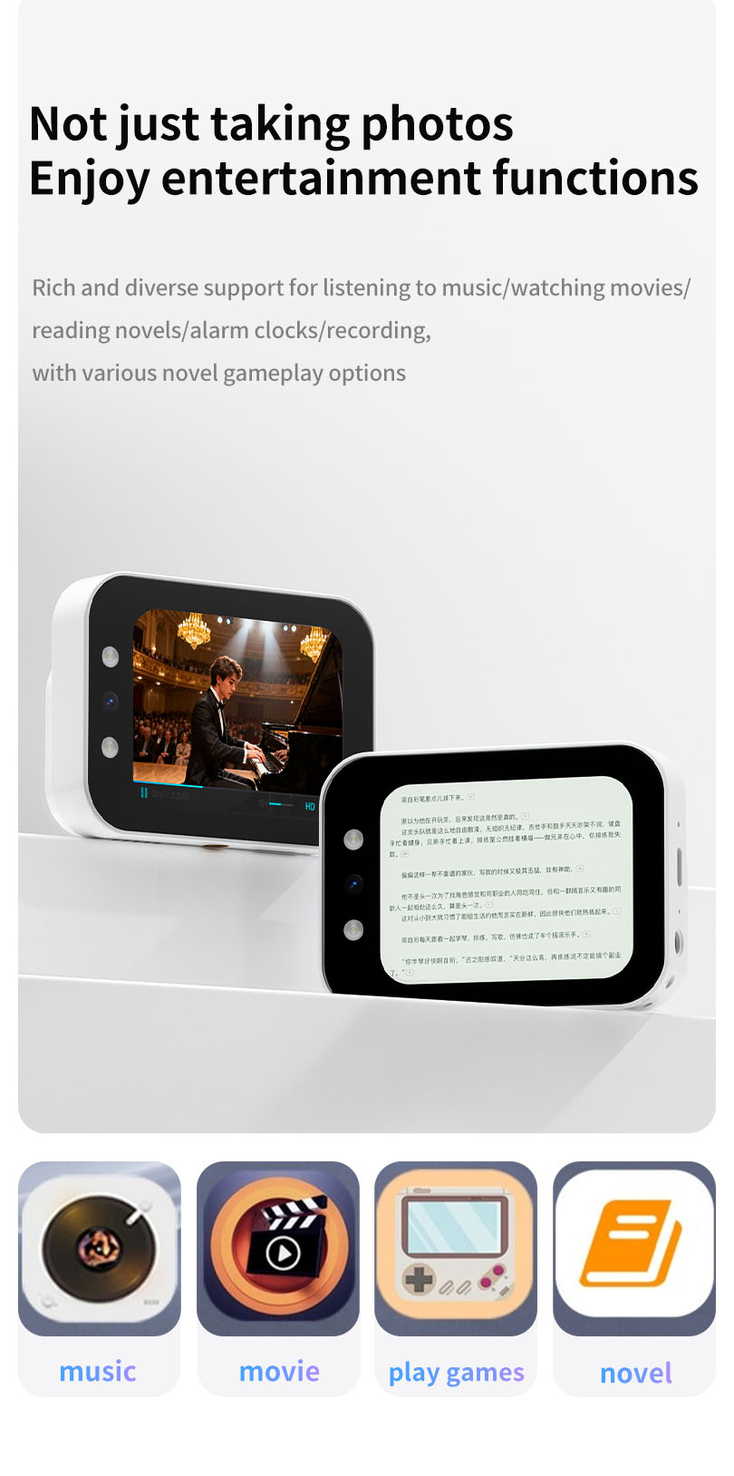 Function: Photography, recording, audio, beauty, filters, built-in wallpaper, custom photo wallpaper, music, movies, novels, memos, alarms, games, slide on/off
