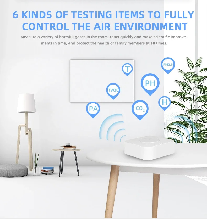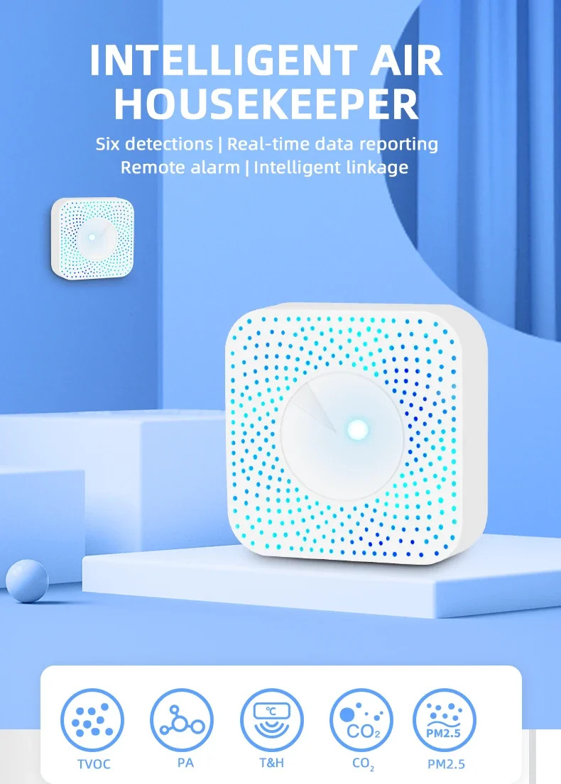 1. Monitors six air quality indicators (TVOC, PA, CO₂, PM2.5, Temperature, and Humidity) for a comprehensive view of indoor air status.