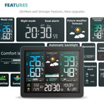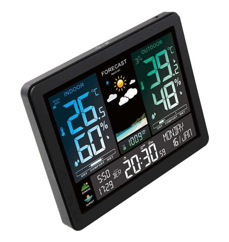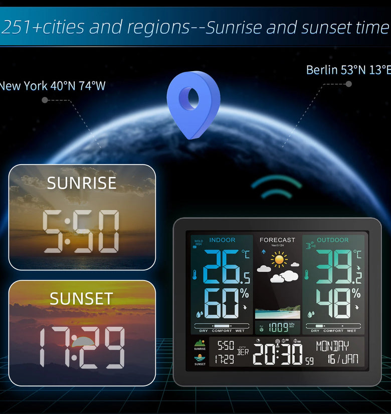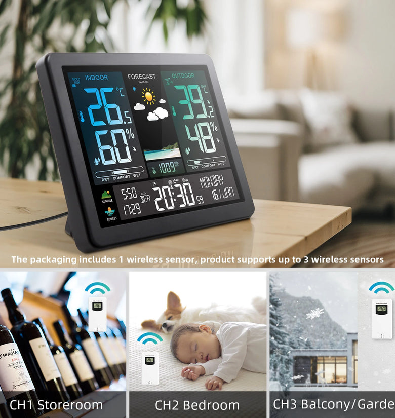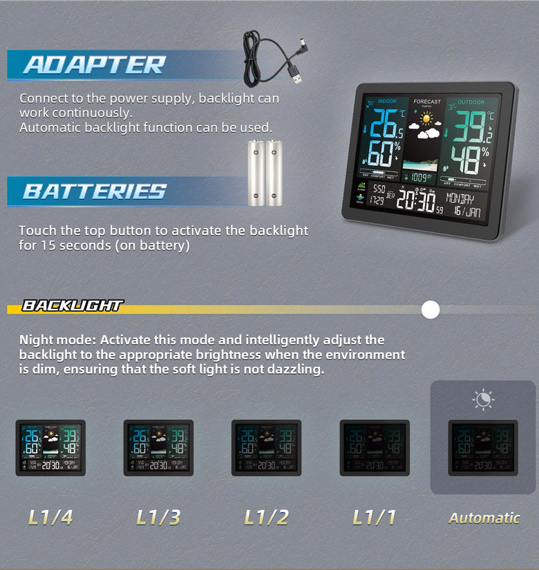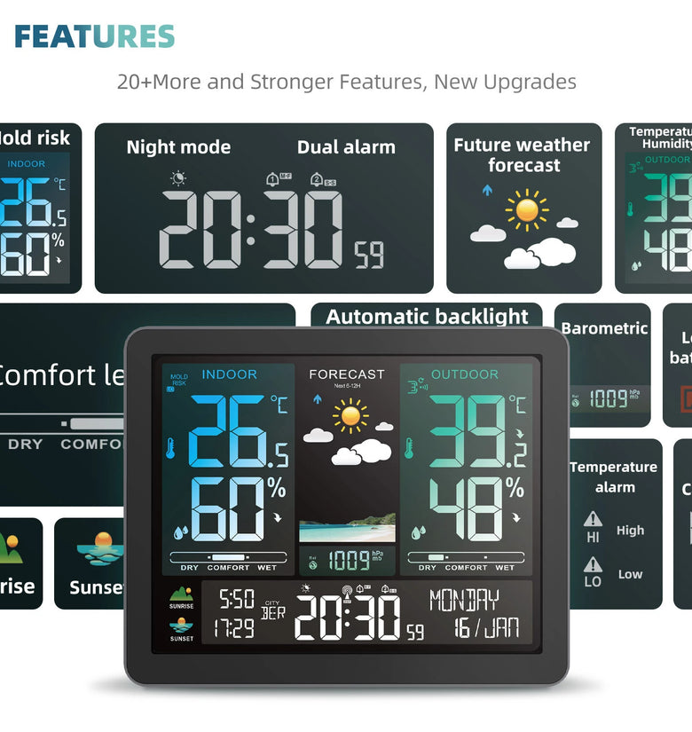 4. Display indoor level 3 mildew risk warning. Display indoor and outdoor comfort level 5. With indoor and outdoor temperature and humidity upper and lower limit alarm and frost point alarm functions. OUTDOOR remote wireless transmitter is attached, which supports receiving up to 3 sets online at the same time.