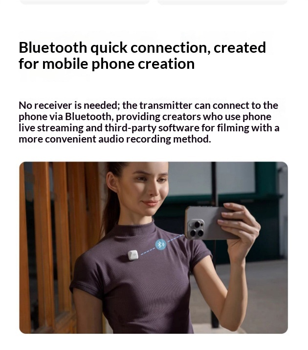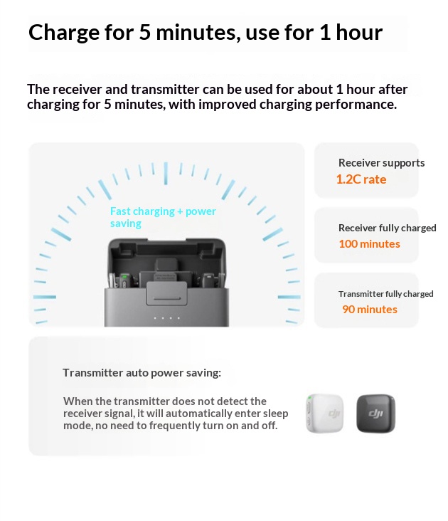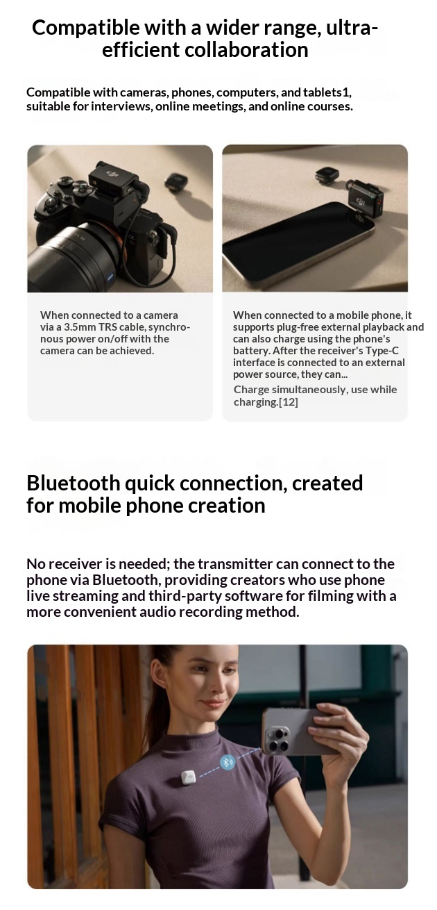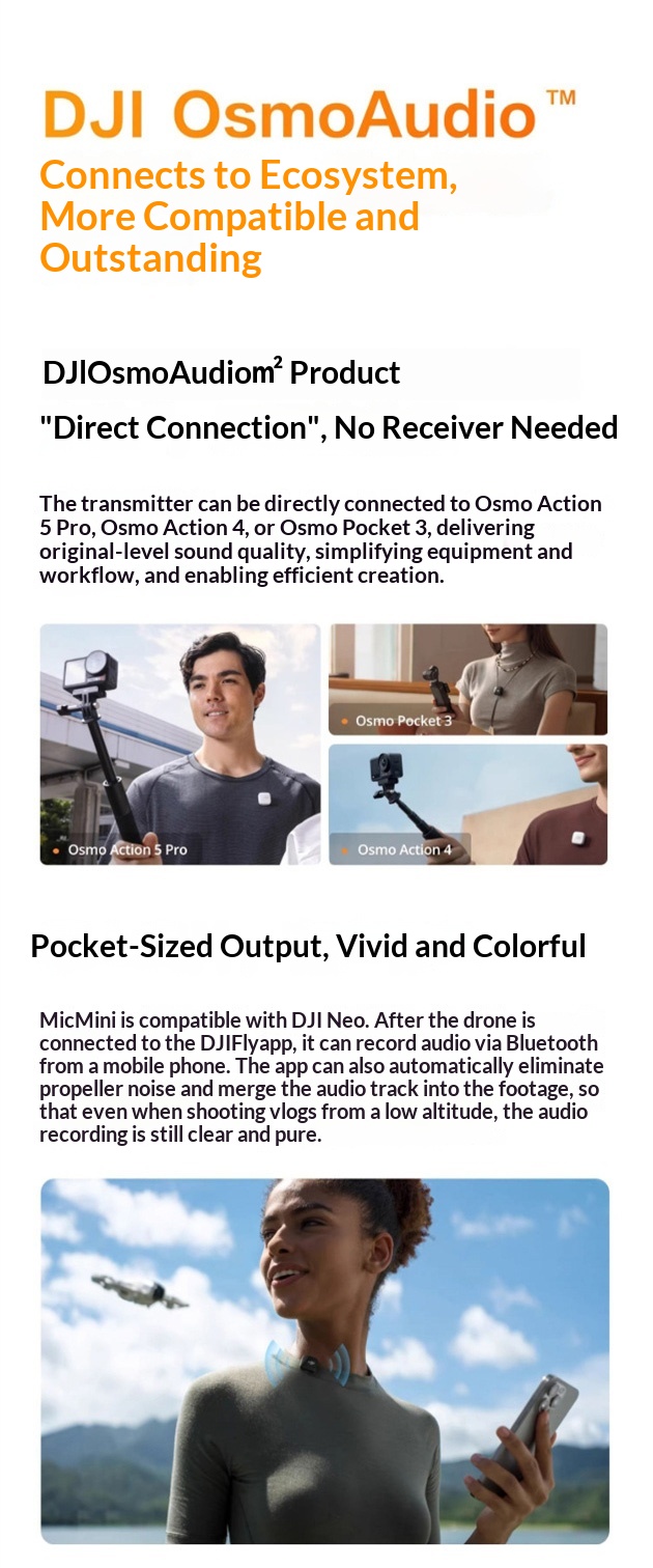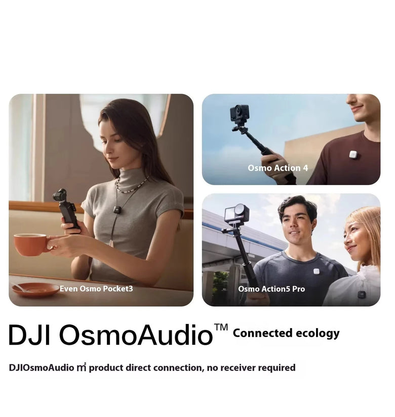 Connection Methods: Connect via receiver; DJI OsmoAudio™ direct connection to Osmo Action 5 Pro, Action 4, Pocket 3; bluetooth direct connection to mobile phone