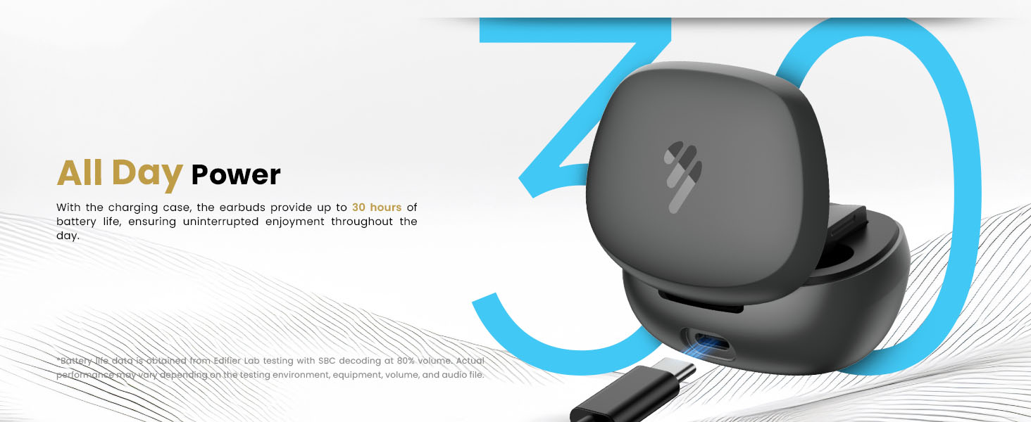 Wireless charging supports 30 hours of total playback time, and fast charging provides 2 hours of playback with just 10 minutes of charge, ensuring you stay connected the whole day.