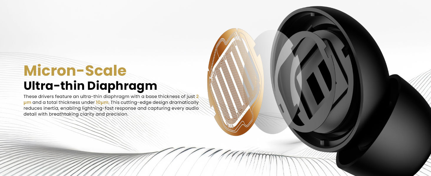 These ultra-thin2μm diaphragms reduce inertia for fast responses, delivering crystal-clear, precise audio detail.
