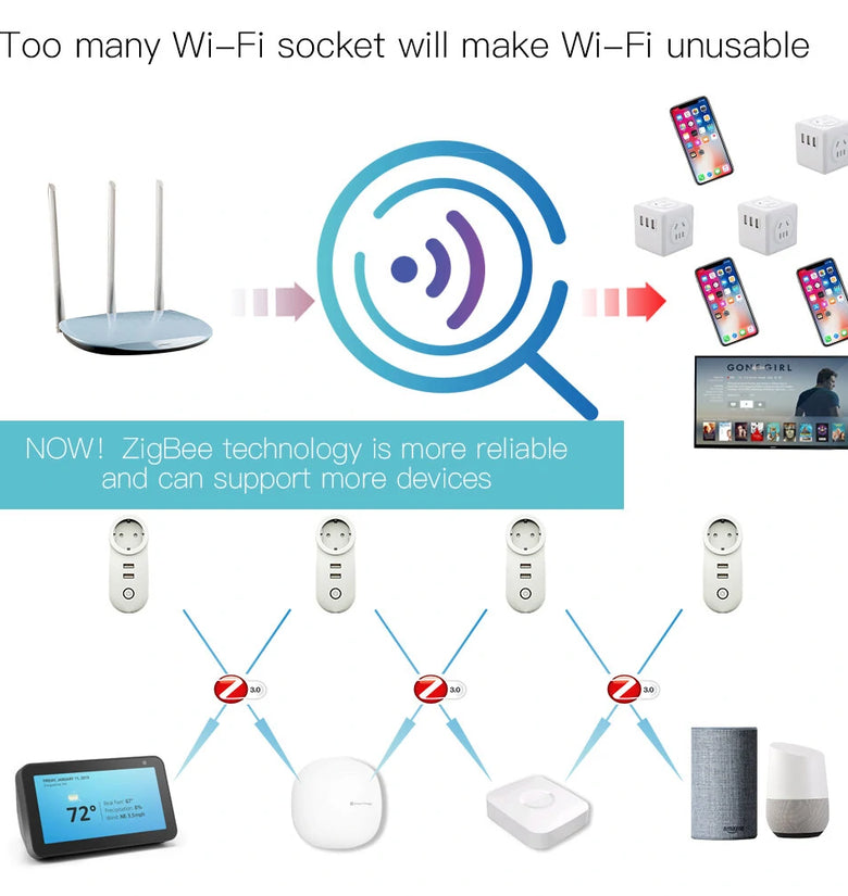 - Not disturb your wifi access like wifi switches/lights: For a home wifi router, there is a limit with keeping the connection of wifi devices (computers, tablets, mobile phones, security cameras, switches...). Normally, if there are 10-20 wifi devices, you might have problems with a wifi device to connect the wifi. As a result, a new wireless technology -ZigBe is developed for Smart Home and Home Automation. ZigBe devices and not disturb your mobile phones, computers' wifi connection at all.
