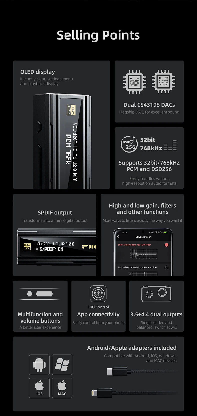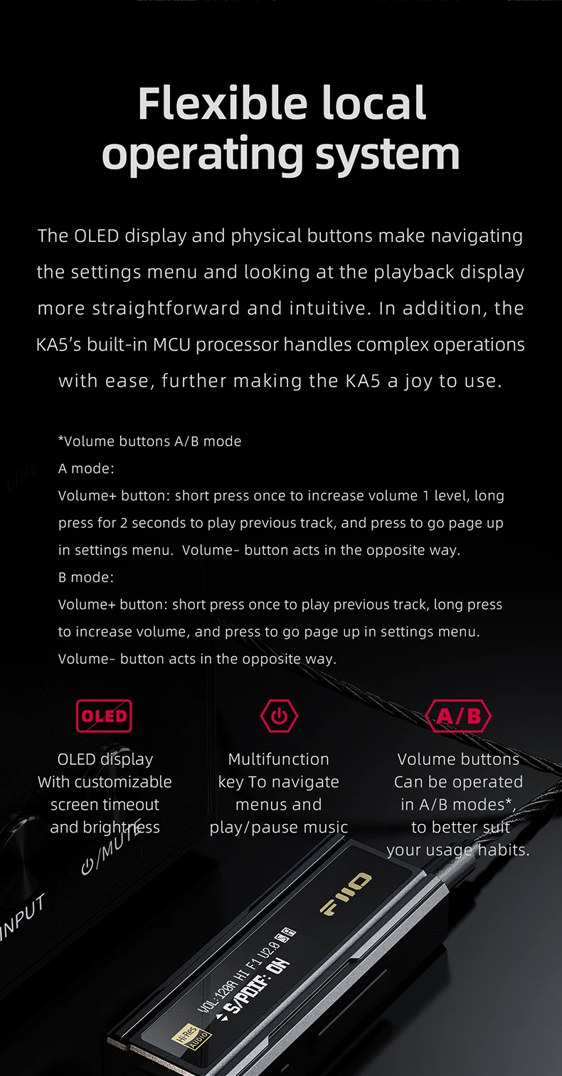 1. OLED Display: Offers clear playback information and supports customizable brightness and timeout settings.