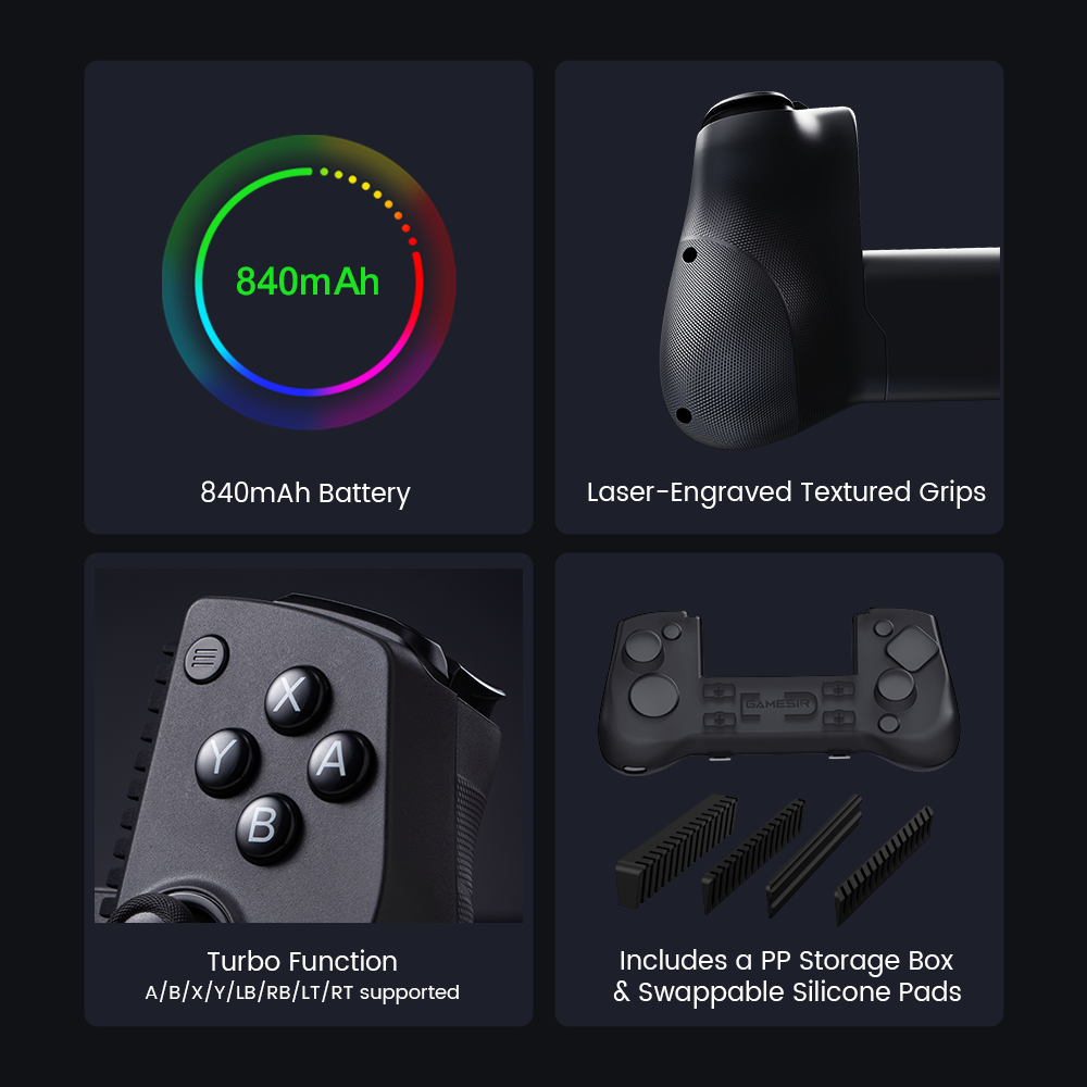 Equipped with GameSir™ Hall Effect sticks, the X5s delivers pinpointaccuracy and smooth 360° control. Using non-contact magnetic sensors, these sticks are built for long-lasting precision and are immune to wear and tear, eliminating stick drift and boosting a lifespan of up to 2 million cycles.