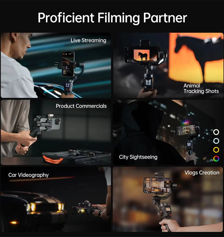2. Extended Battery Life: With up to 12 hours of balanced, stationary operation and 8 hours with AI tracking, this gimbal ensures you never miss a moment during your long shoots.