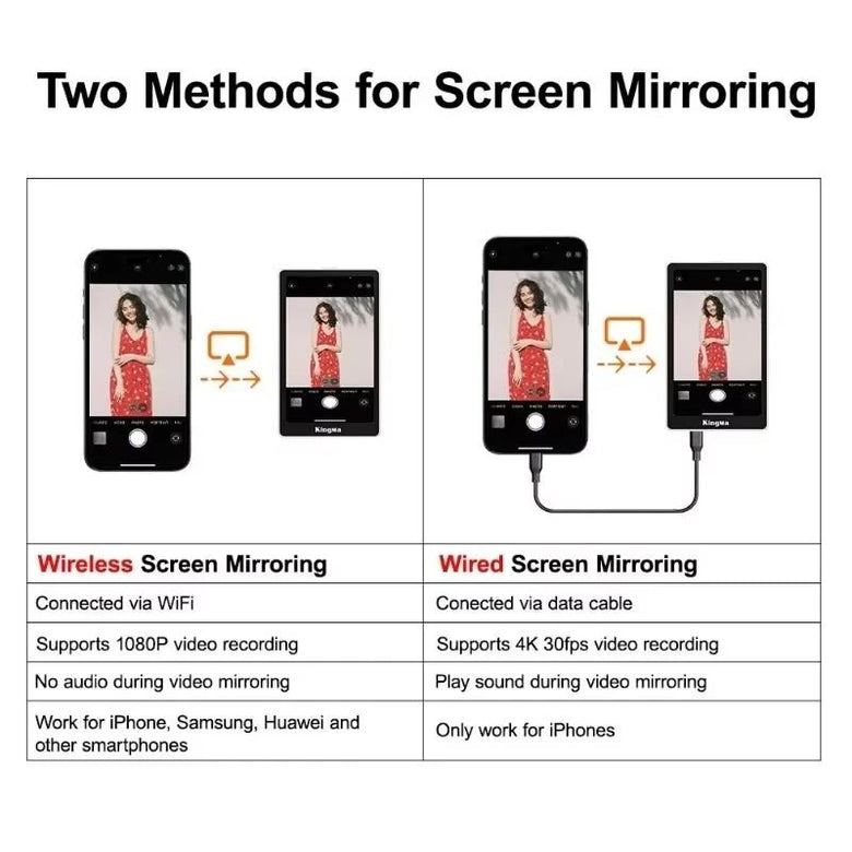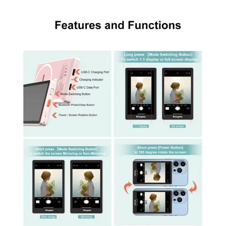Specification:Brand: KingmaModel: VL-PH02 MaxBattery Capacity: 920mAh (3.4Wh)Rated Power: 1.75WVoltage: 3.7VInput: 5V-1AInput Port: USB-CScreen Resolution: 480 x 800 pixelsScreen Size: 3.97 inchesViewing Angle: Full viewing angleMaterials: Plastic + Glass + MagnetDimensions: 103.5 x 62.5 x 12.2mmWeight: Approximately 100gCharge Time: About 2.5 hoursWorking Time: About 2 hoursWireless Connection: WiFi 2.4GFeatures:1. Magnetic Attachment: Securely attaches via MagSafes for compatible iPhones or with a metal ring for other smartphones.2. 4K Video Recording: Supports seamless 4K 30fps recording through wired connections for high-quality content creation.3. Built-in Bluetooth Remote: Enables remote operation with a range of up to 33ft (10m).4. Screen Mirroring Options: Offers both wired (4K, sound playback) and wireless (1080P) mirroring methods for versatility.5. Multifunction Selfie Screen: Enhances rear camera usage for selfies, live streaming, vlogging, and night photography.Package Includes:1 x Kingma VL-PH02 Max Magnetic Selfie Screen1 x Magnetic Sheet1 x Charging Cable1 x Storage Bag1 x Manual1 x Package Box