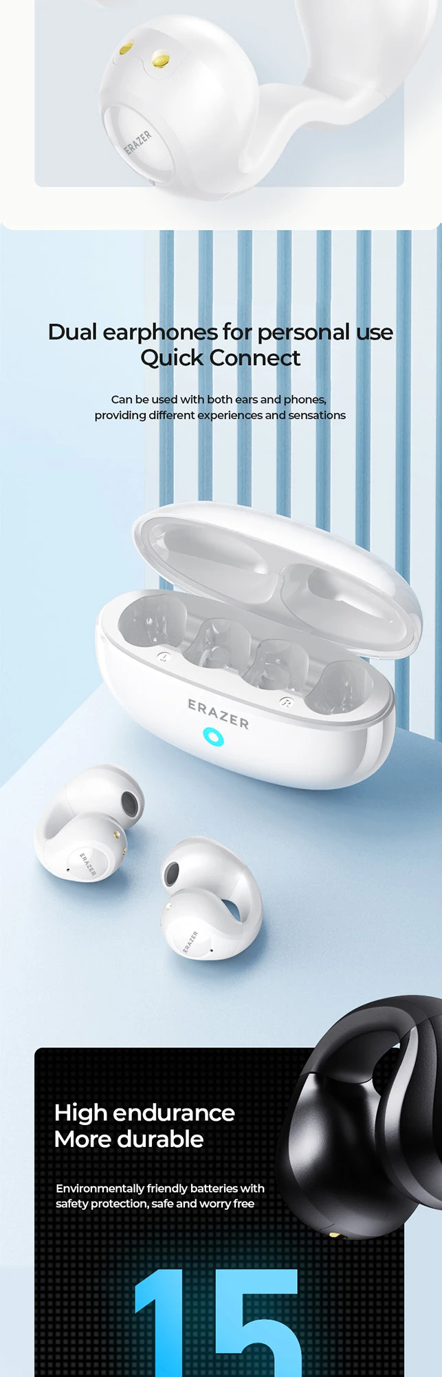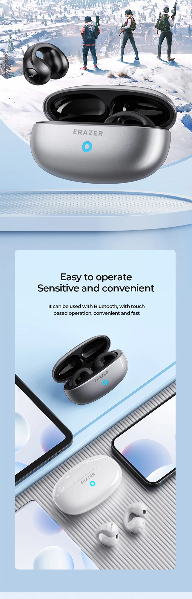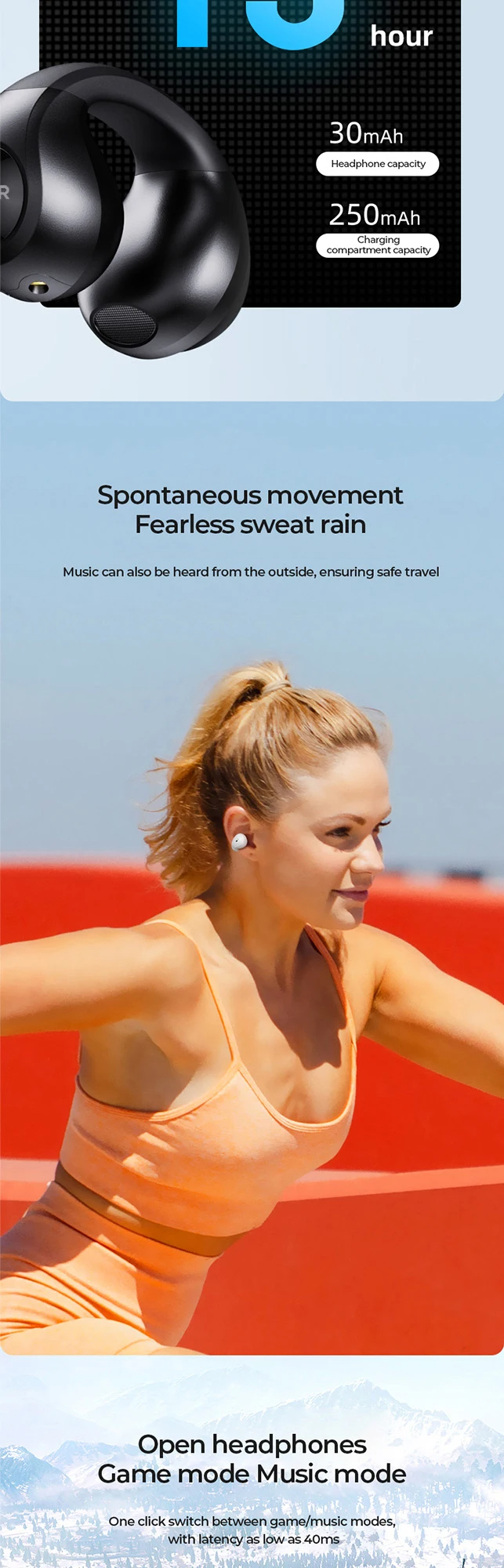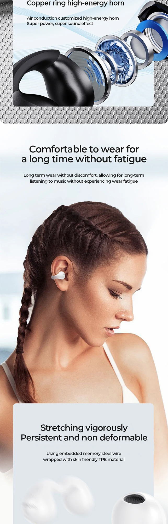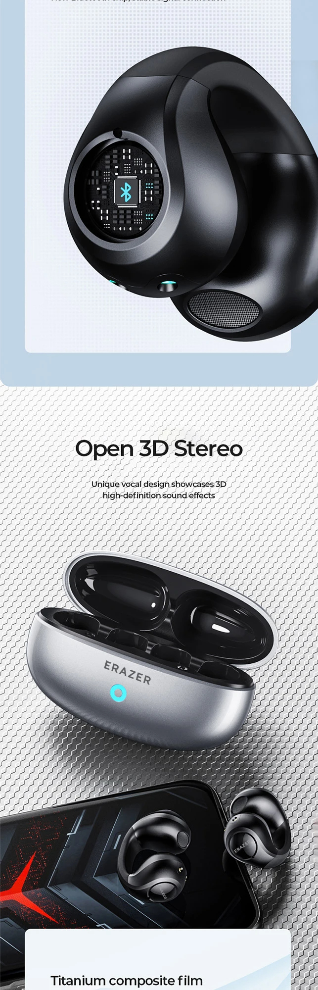 The ergonomic open-ear design showcases 3D surround sound capabilities, creating a panoramic audio field. Enjoy high-definition sound effects that elevate your music, calls, and gaming experience to the next phrase