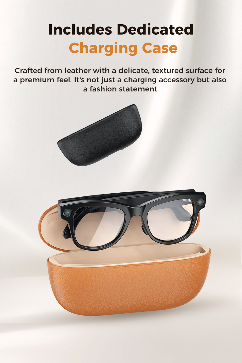 6. Portable Charging Case: Leather-textured case with sleek design, featuring a 3600mAh power bank for emergency phone charging and up to a week of support for smart glasses use.