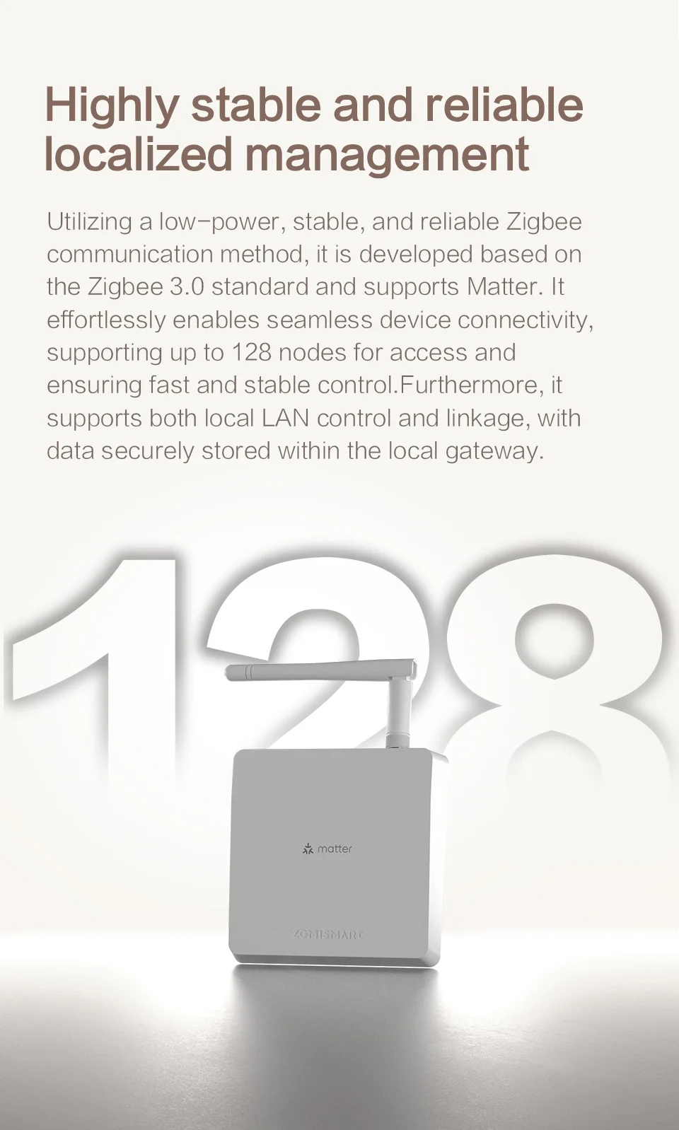 Supports up to 128 Zigbe nodes for reliable local device control and data storage within the gateway for enhanced security.