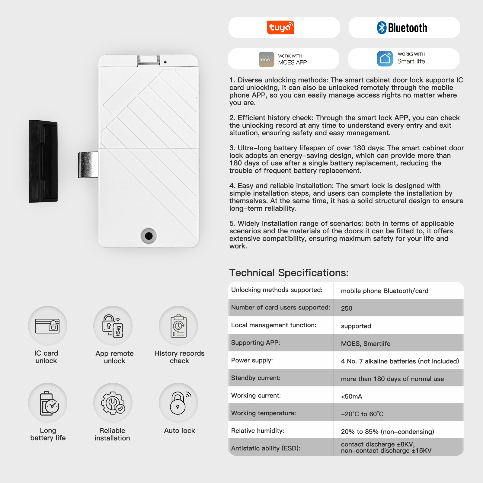 • MOES Tuya Bluetooth Smart Lock ID Card NFC Unlock App Remote Control Security for Cabinets and Drawers Ultra-long Battery Life Easy Installation