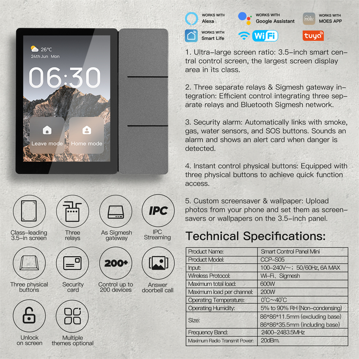 • MOES Tuya WiFi 3.5-inch Smart Center Control Touch Panel Central Screen bluetooth Sigmesh Hub Built-in 3 Relays Physical Buttons