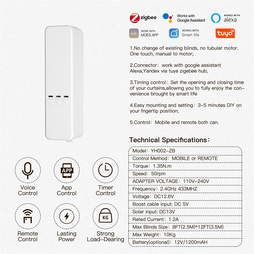 1. No changes to existing blinds, no tubular motors. One-touch operation, manual motor turn.2. Connector: Works with Google Assistant, Alexa, Yandex through Tuya Zigebe gateway.3. Timing: Set the opening and closing time of the curtains, allowing you to fully enjoy the convenience brought by smart life.4. Easy to install and set up: 3-5 minutes DIY at the fingertips.5. Control: Both mobile and remote are available.