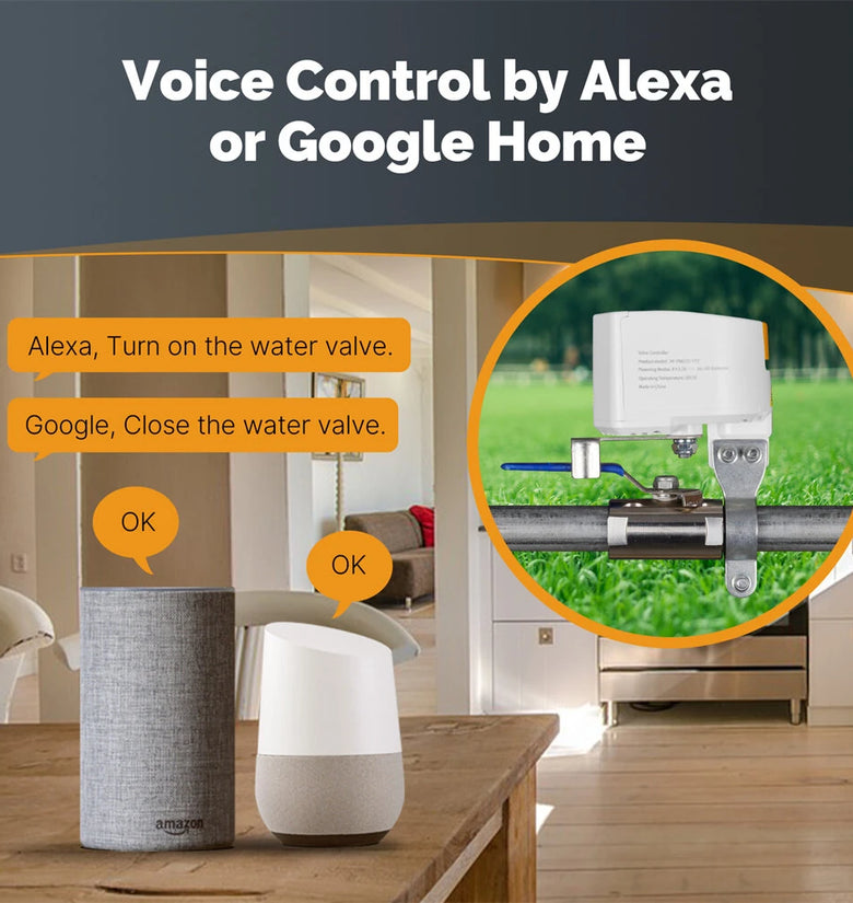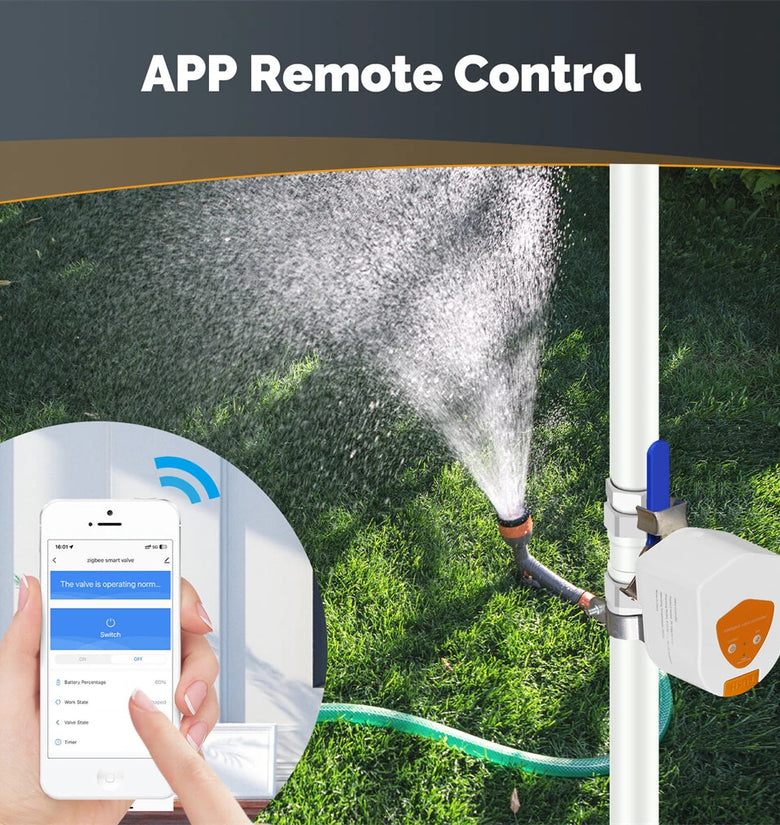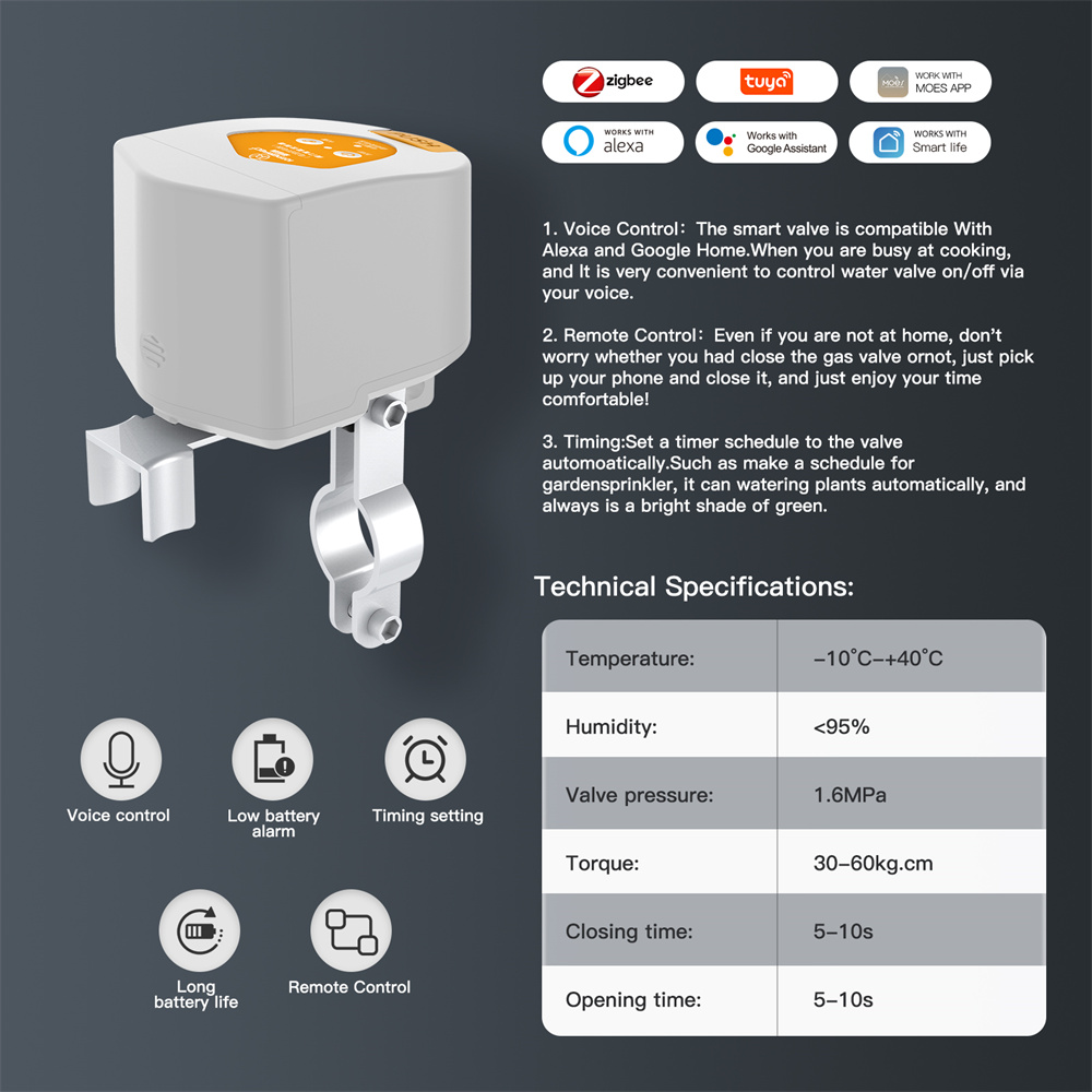 1. Voice control: The smart valve is compatible with Alexa and Google Home. When you are busy cooking, it is very convenient to control the on/off of the water valve by voice.2. Remote control: Even if you are not at home, you don’t have to worry about whether the gas valve has been turned off. Just pick up your phone to turn it off and enjoy your comfortable time.3. Timing setting: Automatically set a timing plan for the valve. For example, setting a plan for a garden waterer can automatically water the plants and always keep them bright green.4. Low battery alarm: When the battery power is lower than the operating voltage, the device buzzer beeps and the indicator light flashes to prompt.5. Smart linkage: When the sensor detects a water leak, the valve will automatically close.
