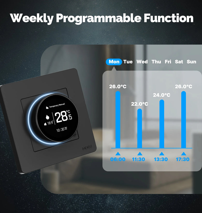 3. Weekly Programmable: Set up to 48 schedules per day to tailor your heating needs according to daily routines and habits, ensuring a personalized experience.