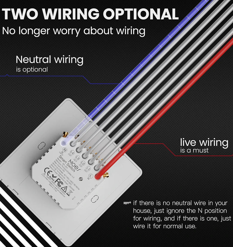 4.Modular Assemble for Customized Combination :1/2/3/4 Gang Star Ring smart switch optional with 2/3/4 Gang switch panel are matched for simple assemble to your own need,easily transforming the smart switch into a scene switch in Tuya Smar APP for scene controls on home smart devices;Two wiring ways optional as single live wire installed if there is no neutral wire in your house or with N+L lines wired.
