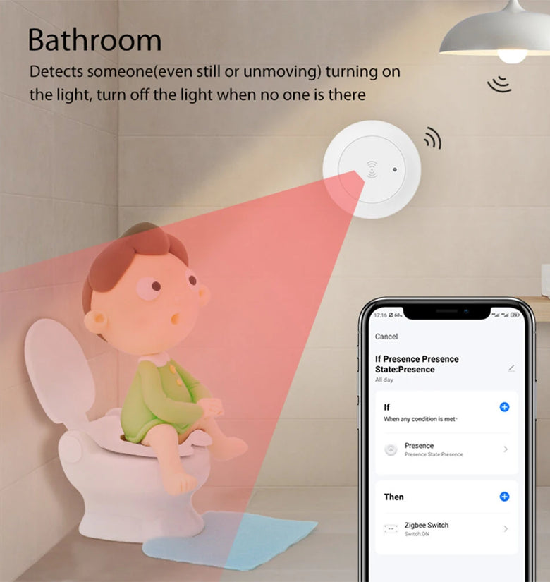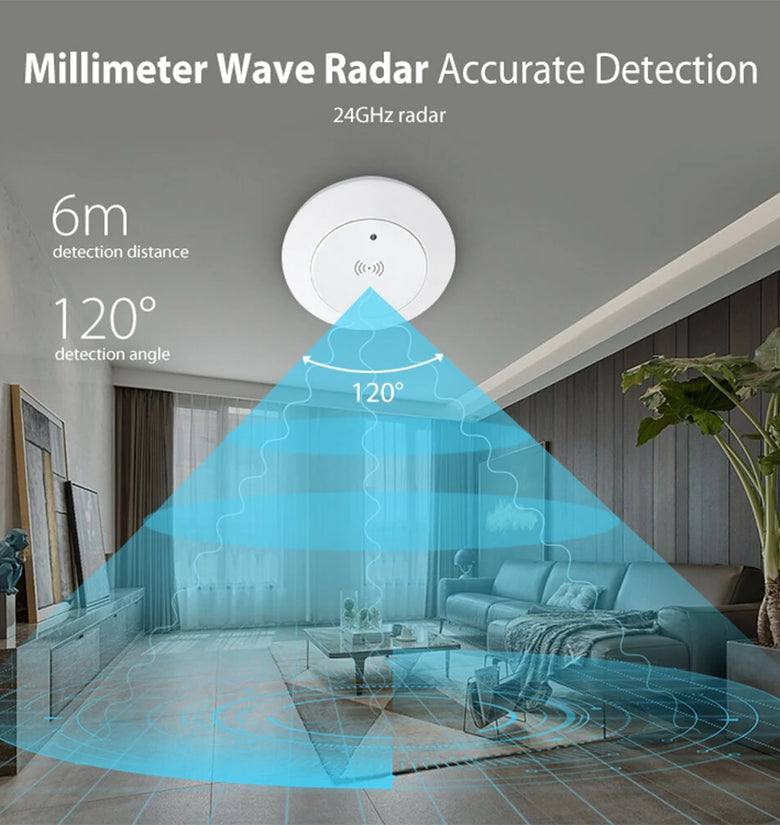 1. High Precision Detection: Utilizes millimeter wave radar technology for accurate presence detection within a 6m range and 120° angle.