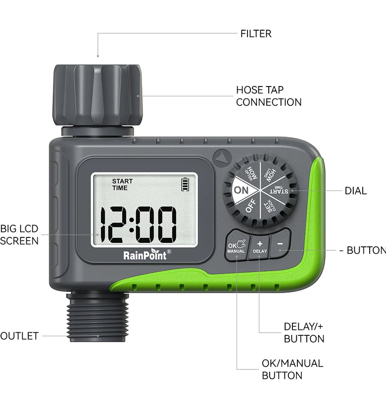 Specification:Brand: RainpointModel: ITV0105Water Pressure Range: 0.5 bar to 8 barWatering Duration: 1min-3h 59minWatering Frequency: 1h-12h, 1 day-7 daysPower Supply: 2 AA 1.5V Alkaline Batteries (not included)Connection Size: Compatible with 1-inch, 3/4-inch, and 1/2-inch threaded hose tapsFeatures:1. Automatic Watering Schedule: Set precise watering times to match plant needs.2. Rain Delay Function: Postpone watering for 24, 48, or 72 hours during rainy days to conserve water.3. Manual Watering Option: Temporarily water plants without altering the set schedule.4. Built-In Metal Filter: Protects the device from debris and ensures efficient operation.5. Large LCD Display: Easy-to-read screen with real-time operation feedback.