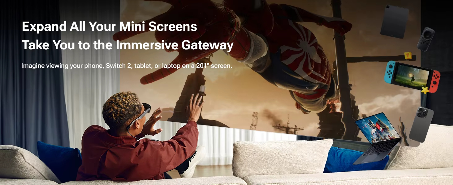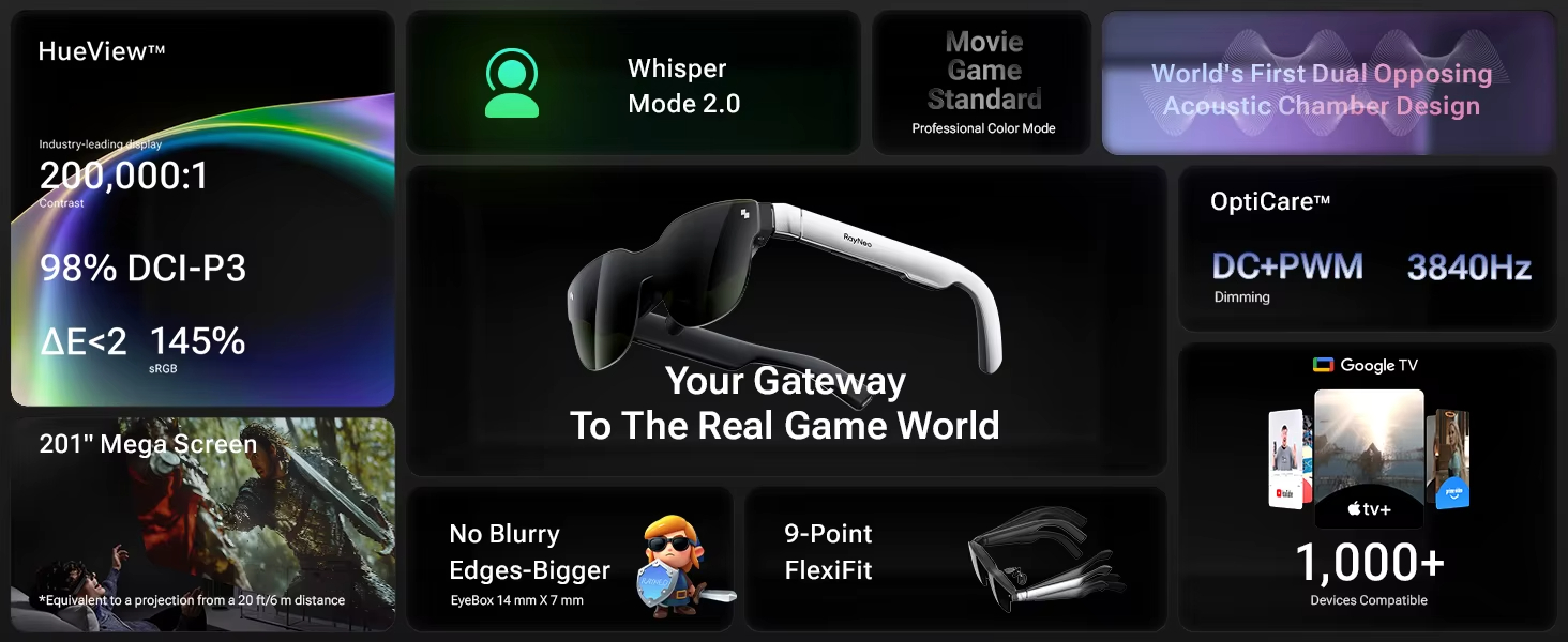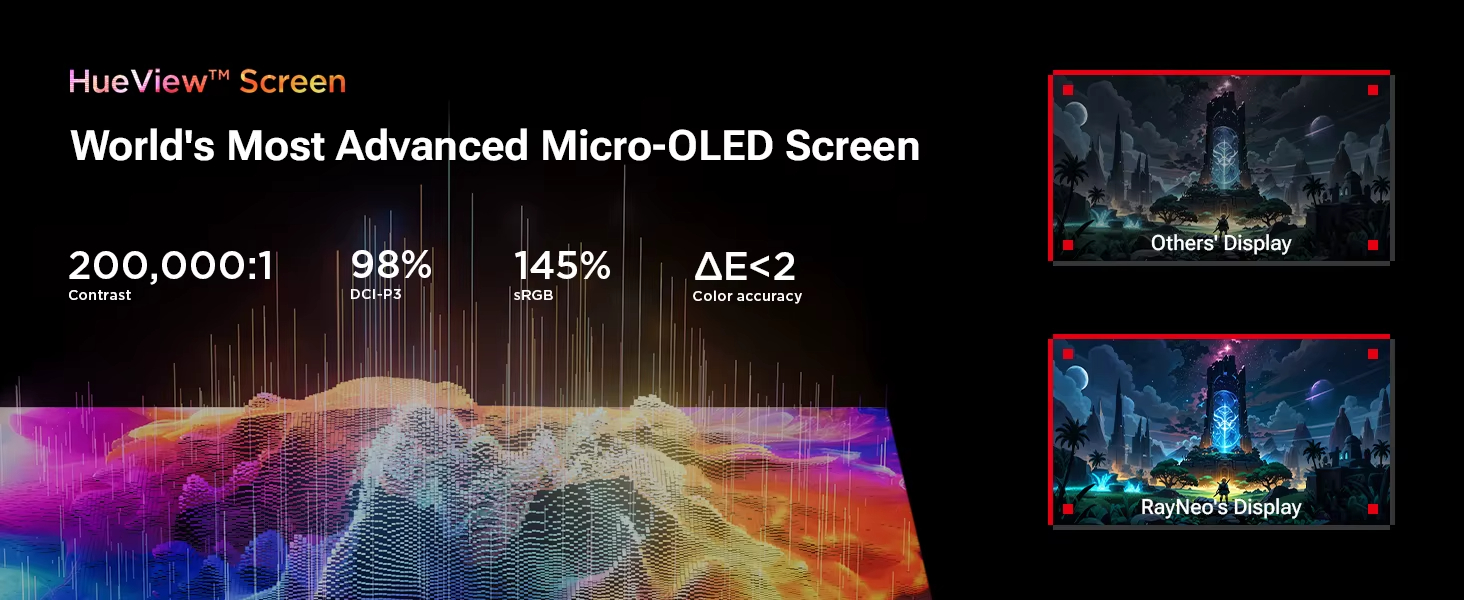 1. HueView Micro-OLED Display: Delivers a 201' virtual screen with 98%DCI-P3 color accuracy, △E<2 color precision, 200,000:1 contrast, and 145% sRGB coverage for vivid, theater-like visuals.