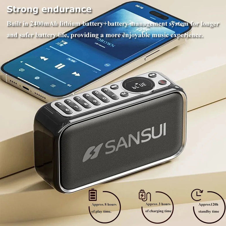 Featuring a high-capacity 2400mAh battery, the SANSUI F35 offers up to 8 hours of continuous playback and an impressive 120 hours of standby time. Enjoy extended listening sessions and on-the-go usage without frequent recharging interruptions.